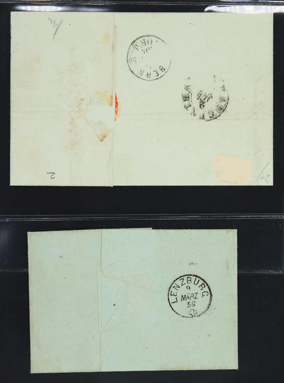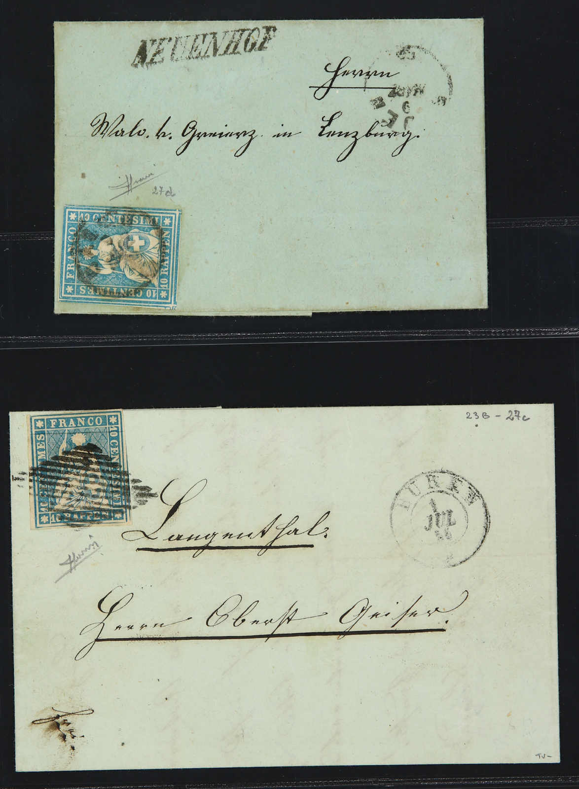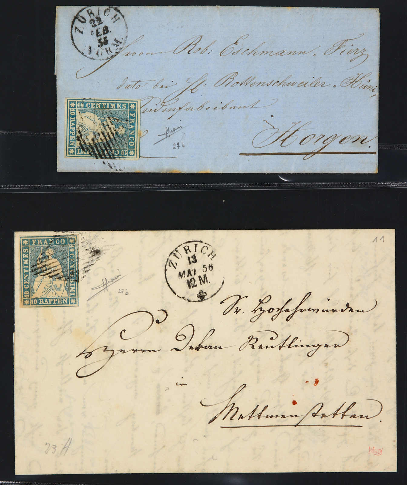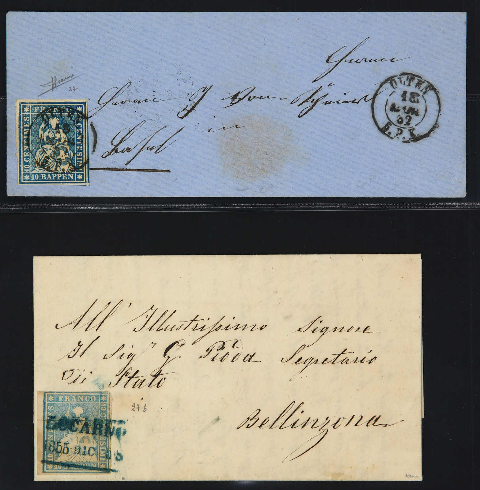SCHWEIZ: 1855/62, sechs Belege mit Einzelfrankaturen von 10 Rp. Werten mit Entwertungen von Neuenhof, Olten, Locarno und Zürich (Image) (imagea)