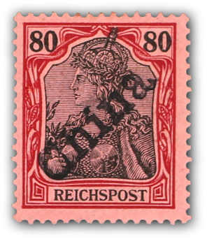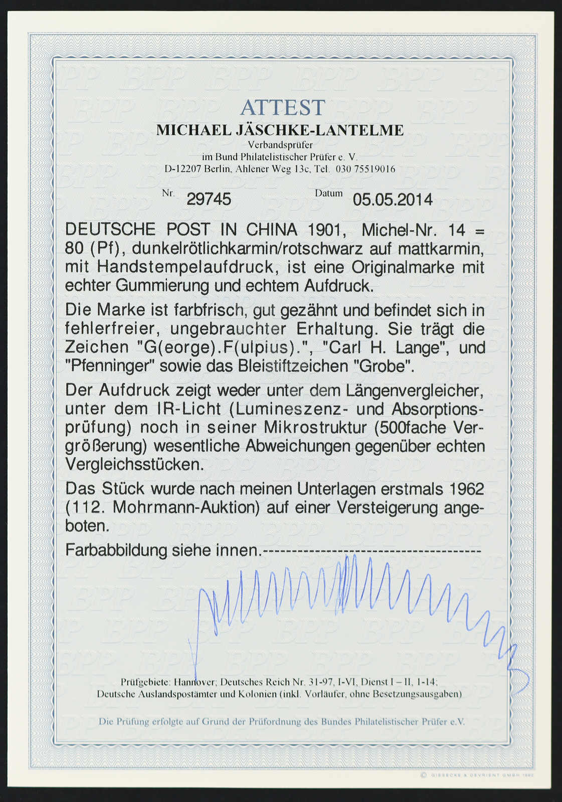 1901, 80 Pfg. dunkelrötlichkarmin/rotschwarz auf mattkarmin mit Handstempelaufdruck, ungebraucht, farbfrisch und einwandfrei, signiert u.a. Pfenninger und Grobe, Fotoattest Jäschke-Lantelme BPP (ME 6.000,-) Provenienz: 112.