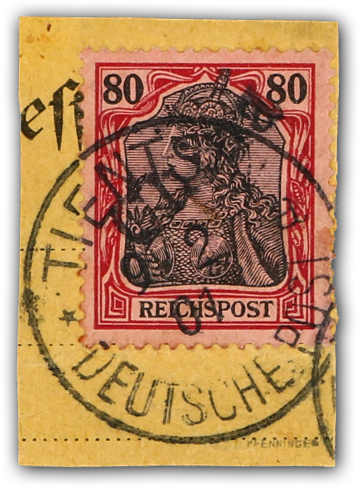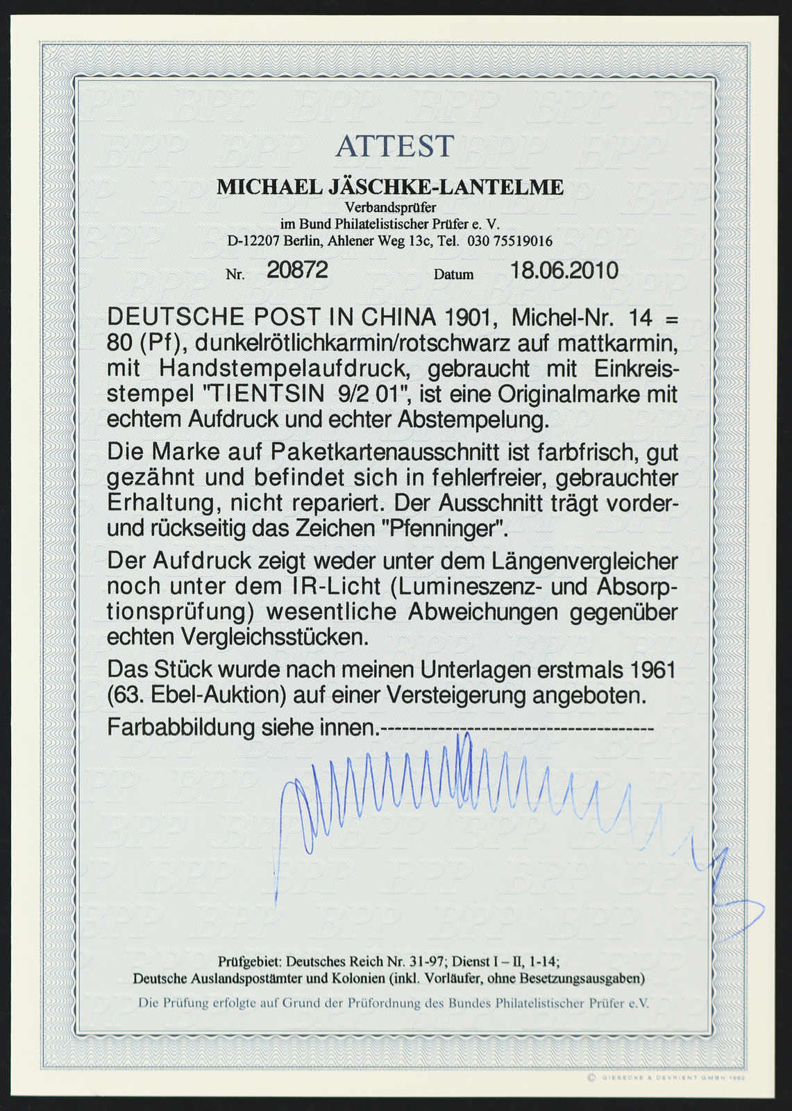 1901, 80 Pfg. dunkelrötichkarmin/rotschwarz auf mattkarmin mit Handstempelaufdruck, sauber gestempelt "TIENTSIN 9/2 01" auf Paketkartenausschnitt, farbfrisch, einwandfrei, signiert Pfenninger, Fotoatteste Pfenninger und Jäschke-Lantelme