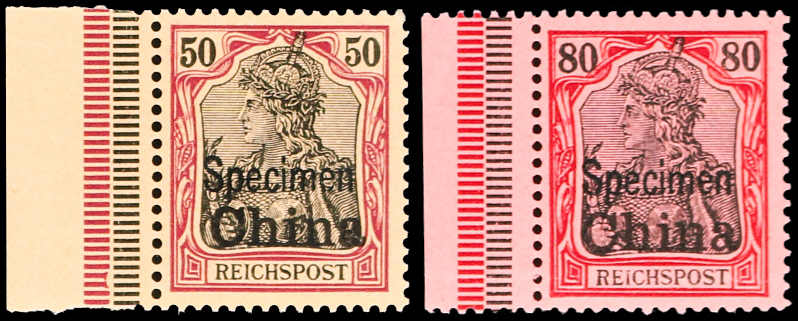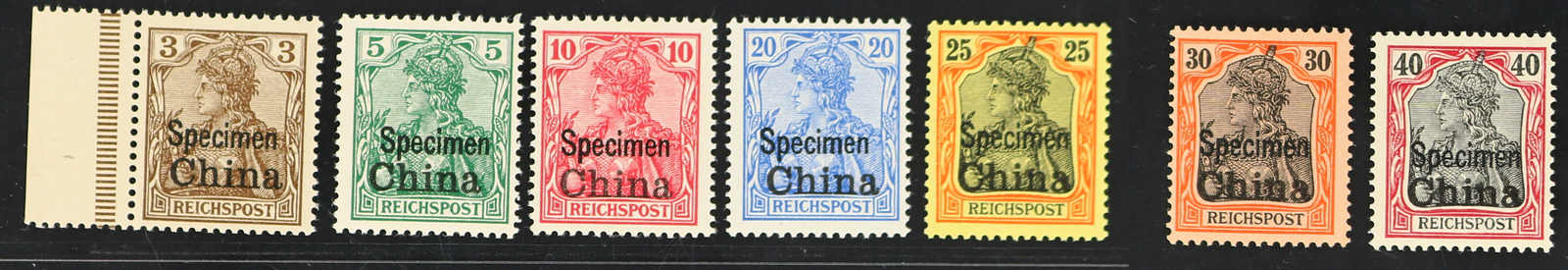 1901, 3 bis 80 Pfg. Germania mit waagerechtem Aufdruck "China" und zusätzlichem Aufdruck "Specimen", neun postfrische Werte, dabei die Werte zu 3, 50 und 80 Pfg. vom linken Bogenrand, alle Marken farbfrisch und gut gezähnt, teils sign.