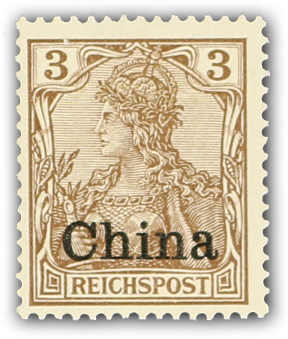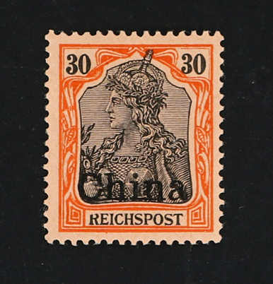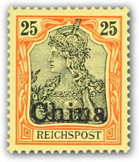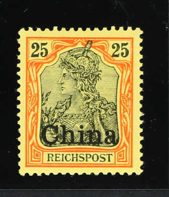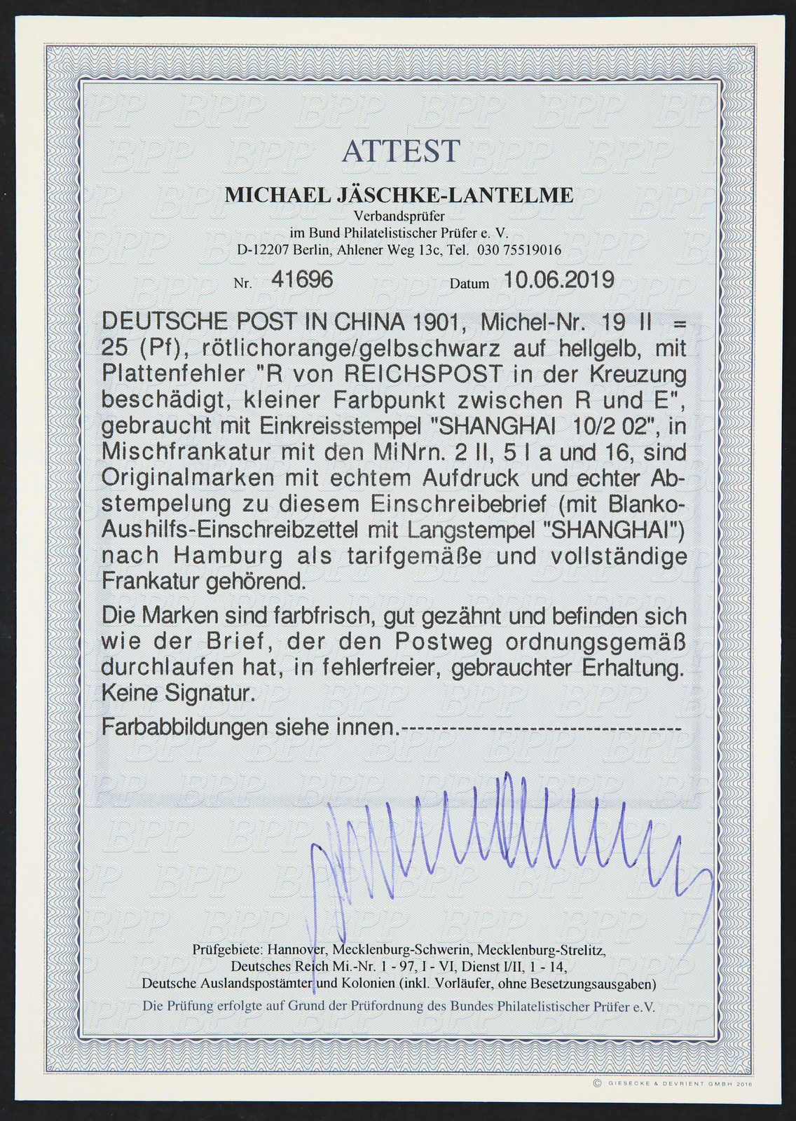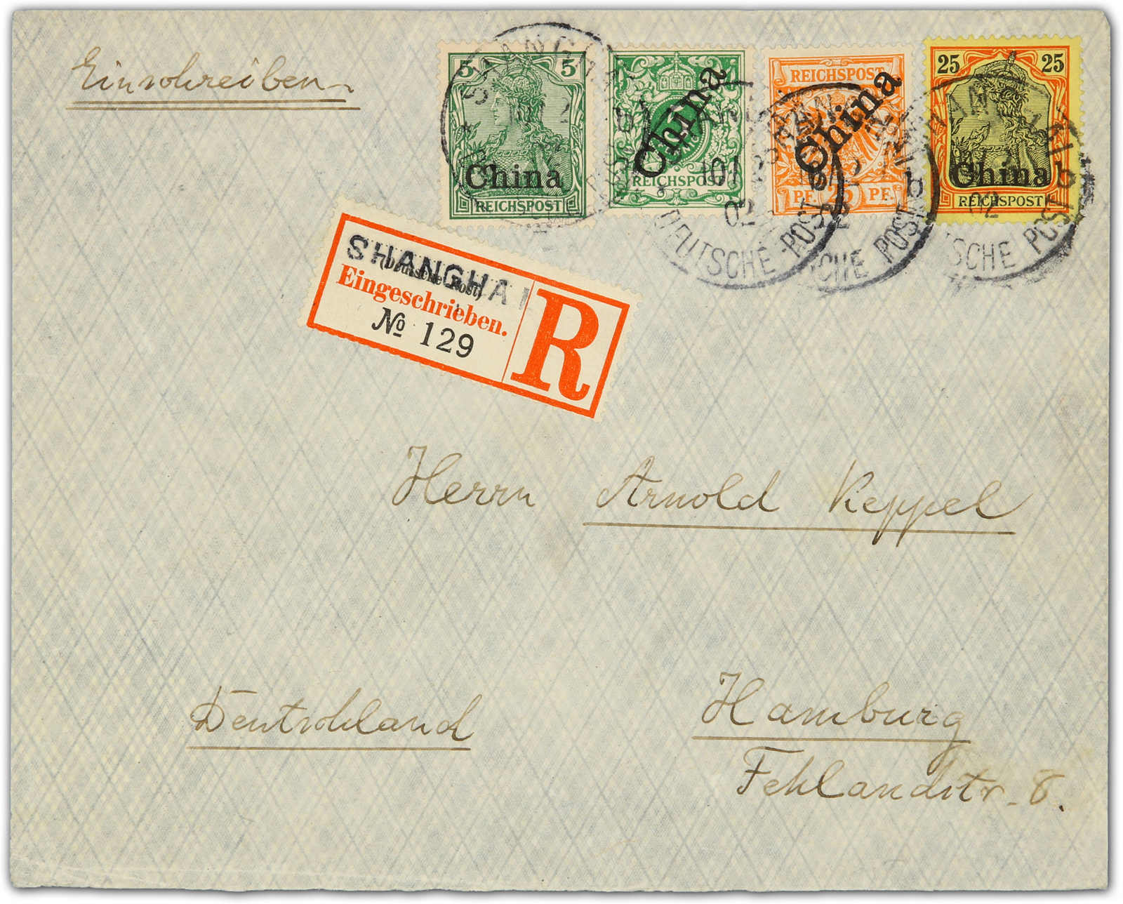 1902, 25 Pfg. Germania mit waagerechtem Aufdruck "China" und dem Plattenfehler II auf der Urmarke "R von REICHSPOST in der Kreuzung beschädigt", in MiF mit 5 und 25 Pfg. Krone/Adler mit schrägem Aufdruck "China" und 5 Pfg. Germania mit