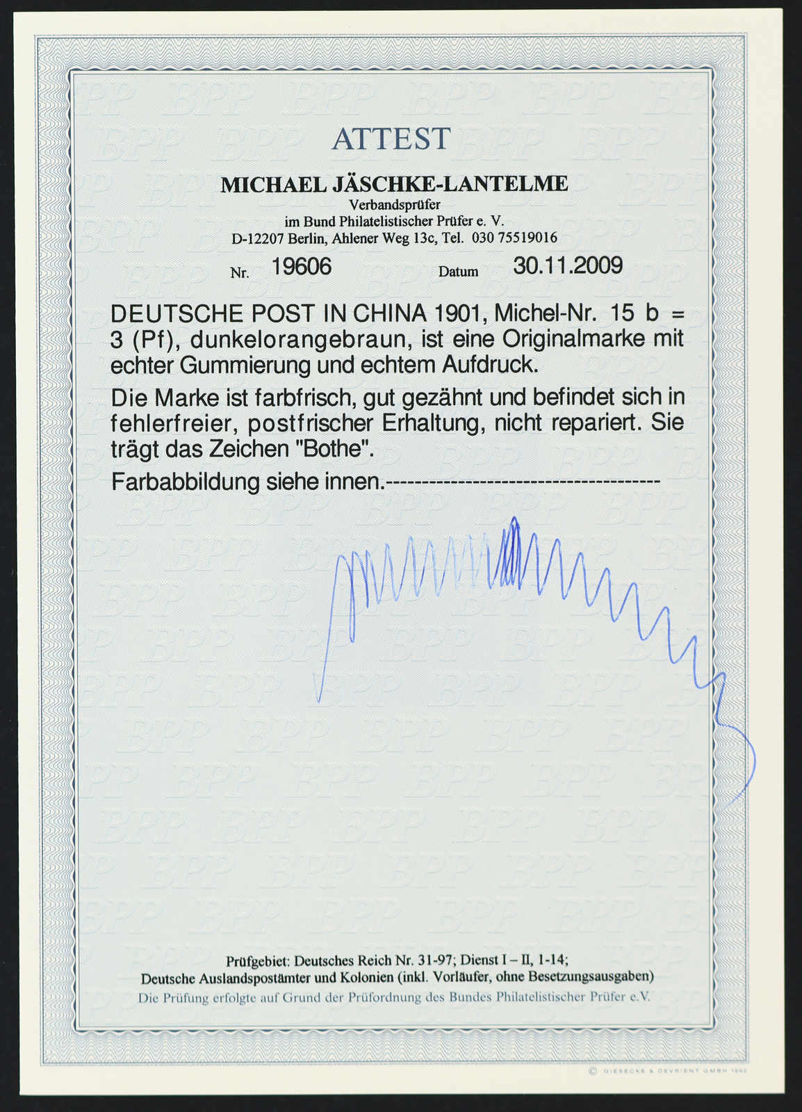 1901, 3 Pfg. Aufdruckausgabe dunkelorangebraun, postfrisch, einwandfrei, signiert Bothe, Fotoattest Jässchke-Lantelme BPP (ME 480,-) (Image) (imagea)
