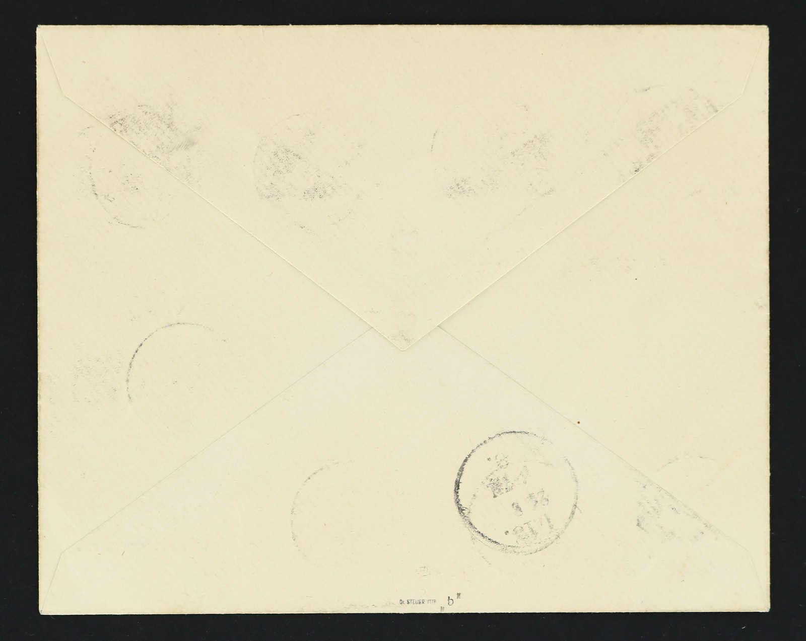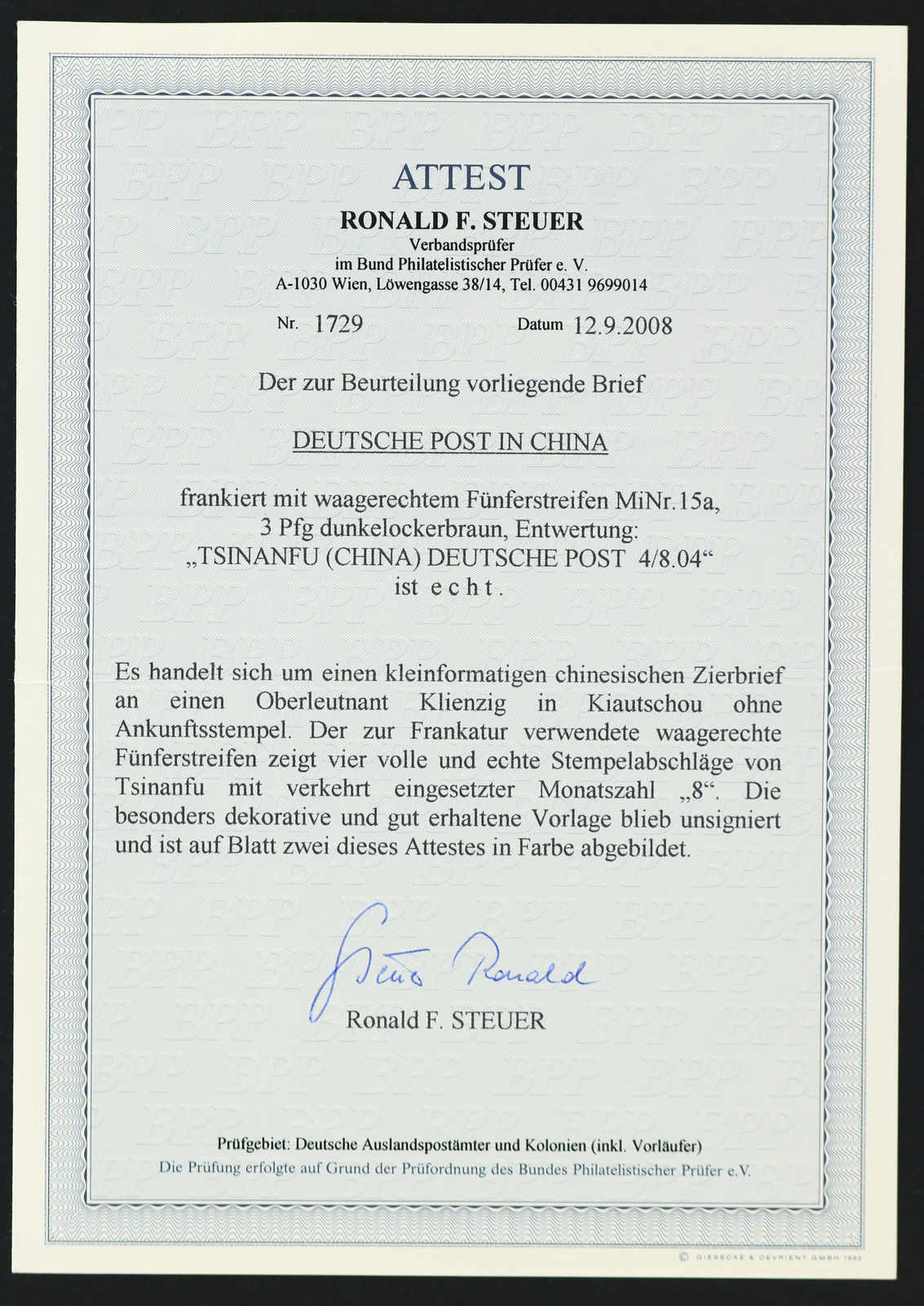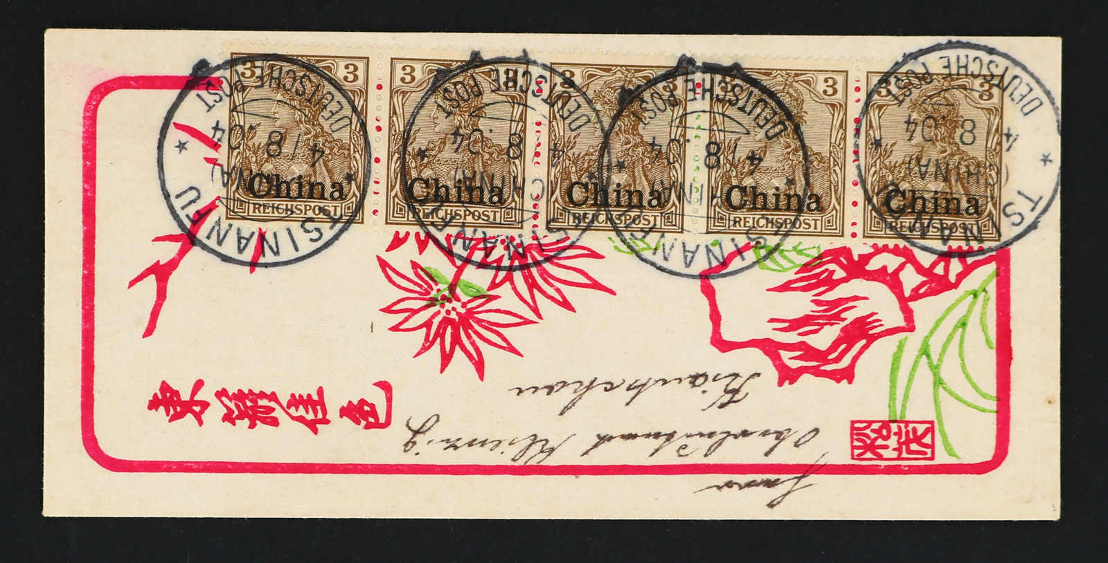 1901, 3 Pfg. Aufdruckausgabe dunkelorangebraun, waagerechter Fünferstreifen mit glasklaren Entwertungen "TSINANFU (CHINA) DEUTSCHE POST 4/8 04" (verkehrt eingesetzte Monatszahl), auf kleinformatigem chinesischen Zierbrief an einen