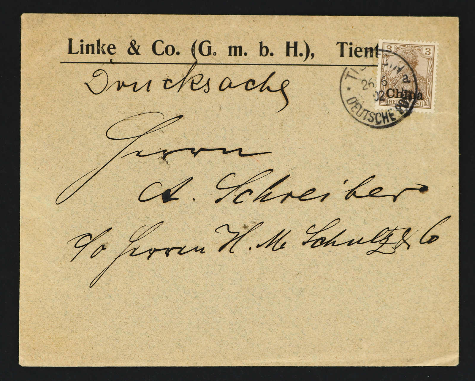 1901, 3 Pfg. dunkelorangebraun mit waagerechtem Aufdruck "China" als portogerechte Einzelfrankatur auf Ortsdrucksache, aufgegeben "TIENTSIN DEUTSCHE POST 26.6.02", doppelt sign. Kilian BPP, einwandfrei (Image)