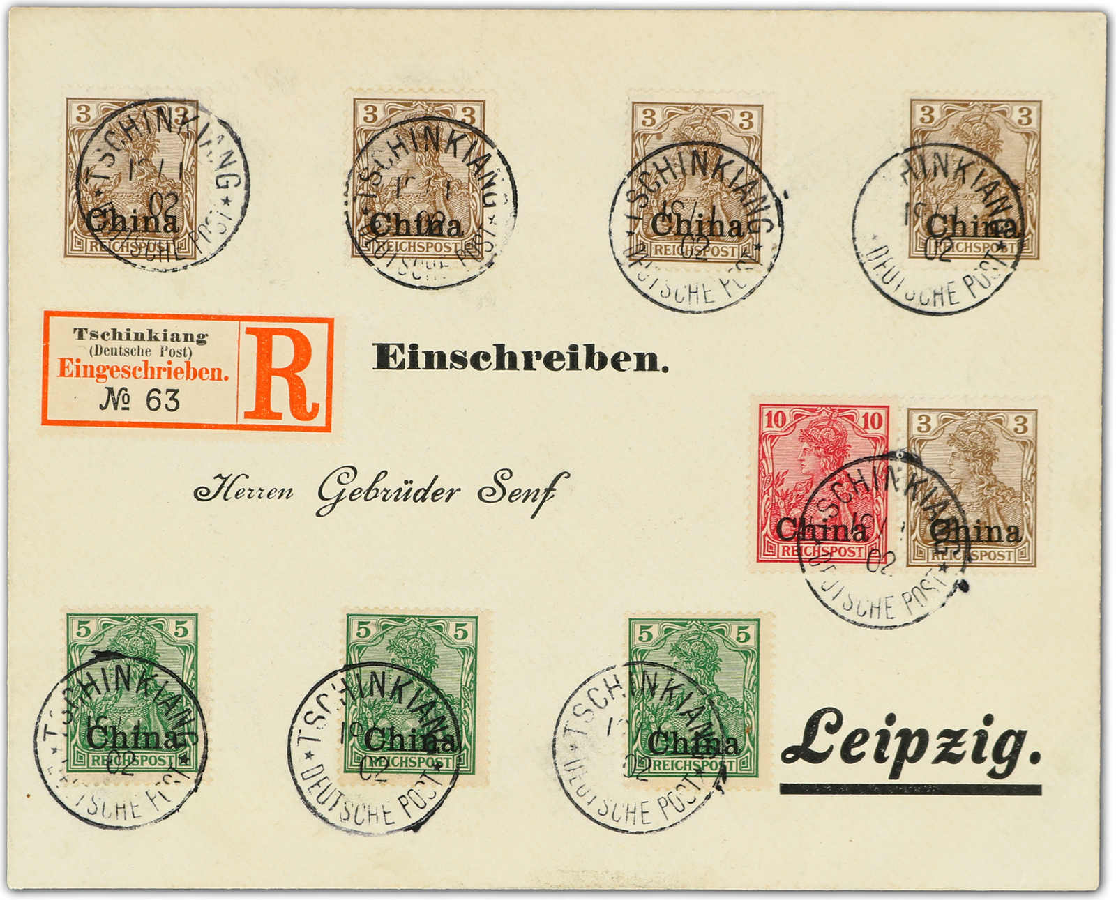 1901, 3 Pfg. Germania dunkelorangebraun mit waagerechtem Aufdruck, 5 Werte in Mischfrankatur mit 5 Pfg. Germania (3 Werte) und 10 Pfg. Germania auf portogerechtem Einschreibbrief, aufgegeben "TSCHINKIANG 19/1 02", adressiert an Gebr. Senf