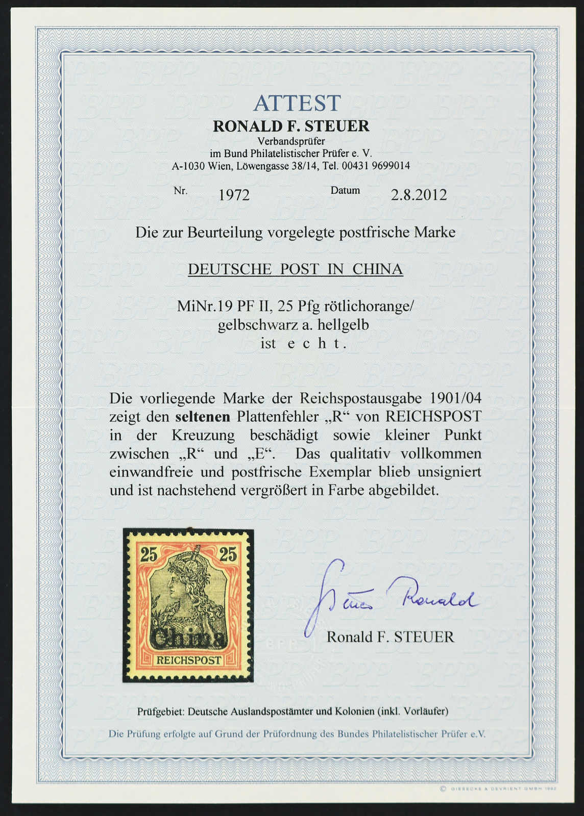 1900, 25 Pfg. Aufdruckausgabe rötlichorange/gelbschwarz auf hellgelb, mit Plattenfehler "R von REICHSPOST in der Kreuzung beschädigt sowie kleiner Punkt zwischen R und E", postfrisch, einwandfrei, Fotoattest Steuer BPP (ME postfrisch