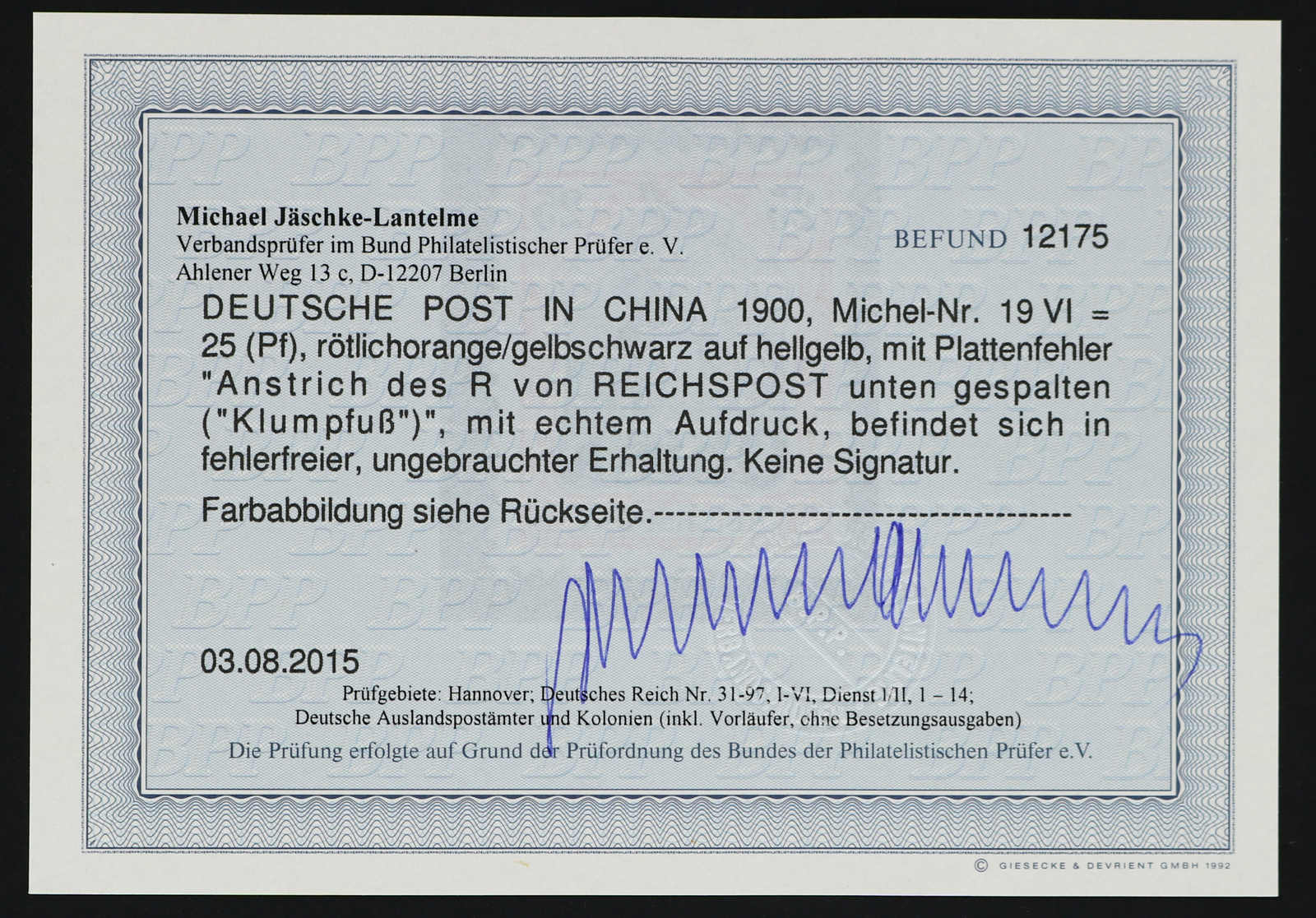 1900, 25 Pfg. Aufdruckausgabe rötlichorange/gelbschwarz auf hellgelb, mit Plattenfehler "Anstrich des R von REICHSPOST unten gespalten ('Klumpfuß')", ungebraucht, einwandfrei, Fotobefund Jäschke-Lantelme BPP (ME ungebraucht nicht