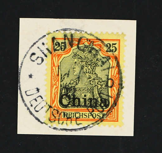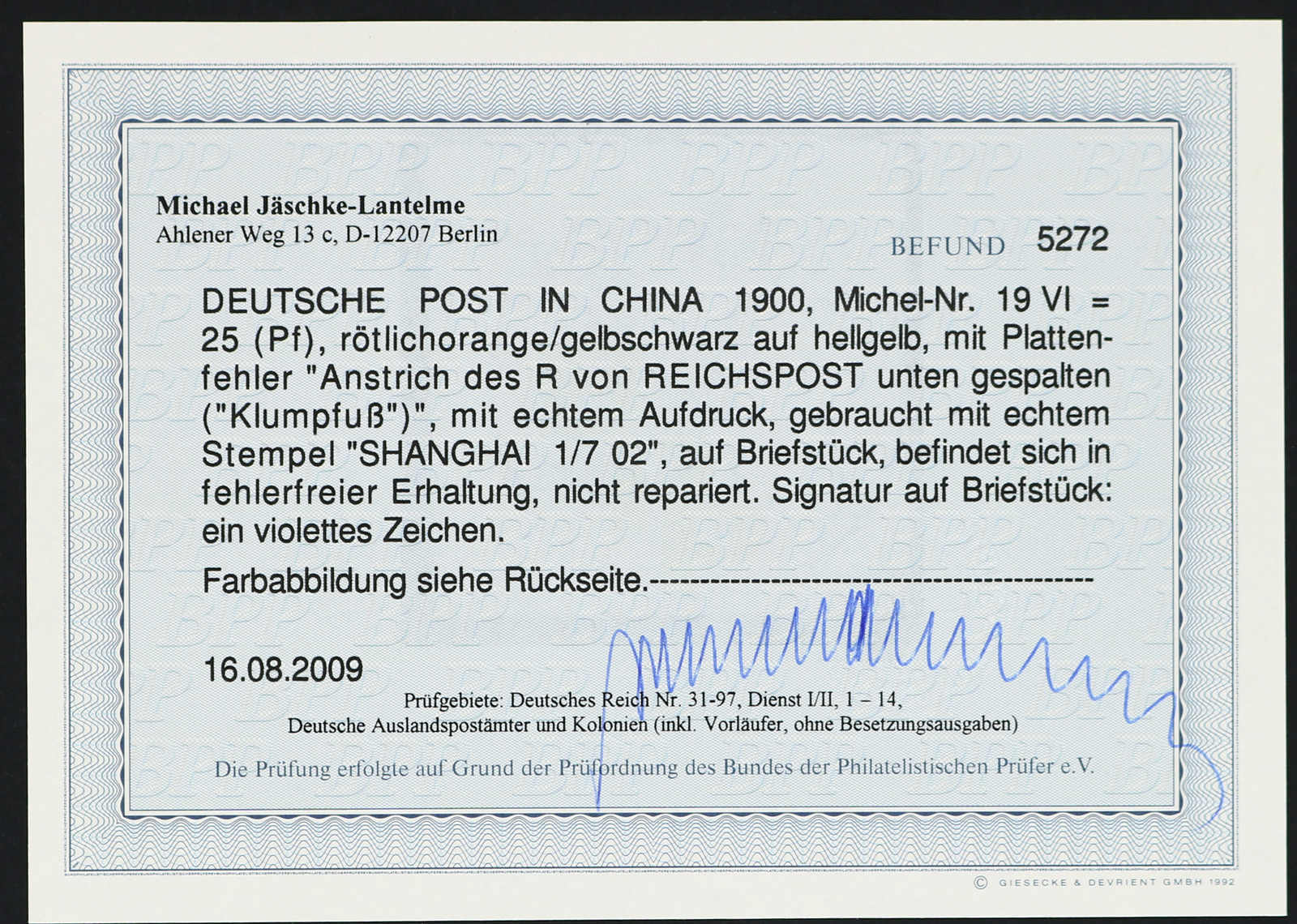 1900, 25 Pfg. Aufdruckausgabe rötlichorange/gelbschwarz auf hellgelb, mit Plattenfehler "Anstrich des R von REICHSPOST unten gespalten ('Klumpfuß')", sauber gestempelt "SHANGHAI 1/7 02" auf Briefstück, einwandfrei, signiert, Fotobefund
