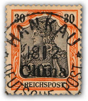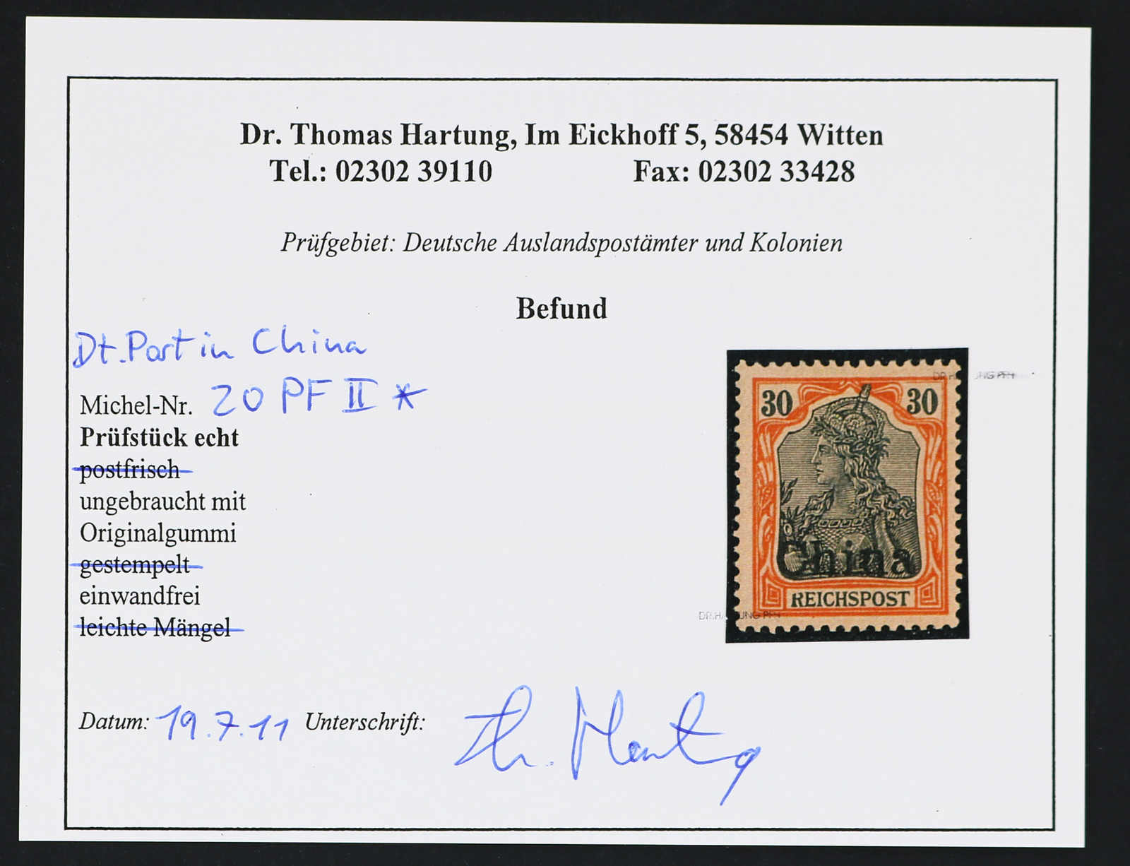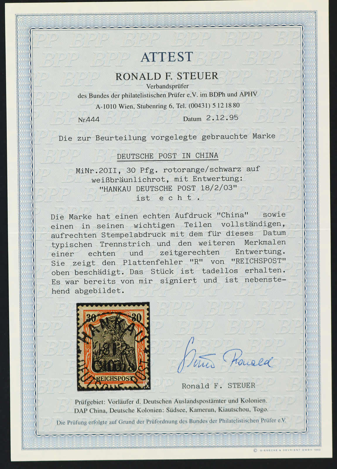 1901, 30 Pfg. Aufdruckausgabe rötlichorange/rotschwarz auf mattgelblichorange, mit Plattenfehler "Kopf des R von REICHSPOST oben schräg abgeschnitten und offen", glasklar gestempelt "HANKAU DEUTSCHE POST 18/2 03", einwandfrei, Fotoattest