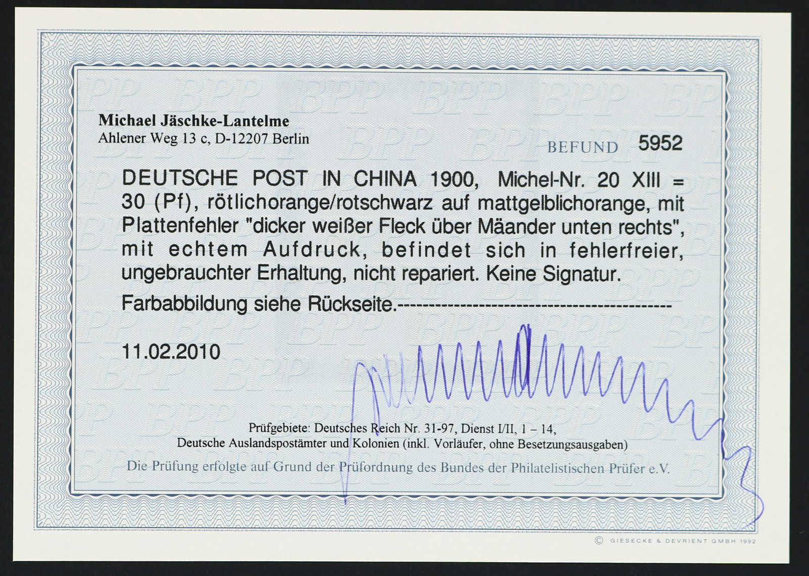 1900, 30 Pfg. Aufdruckausgabe rötlichorange/rotschwarz auf mattgelblichorange, mit Plattenfehler "dicker weißer Fleck über Mäander unten rechts", ungebraucht, einwandfrei, Fotobefund Jäschke-Lantelme BPP (ME ungebraucht nicht notiert) (Image) (imagea)