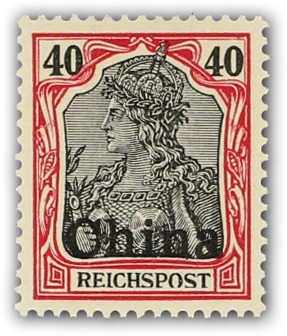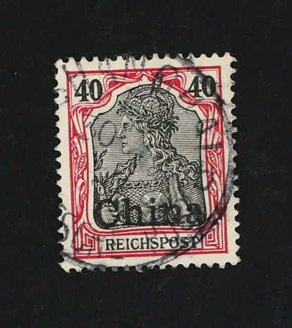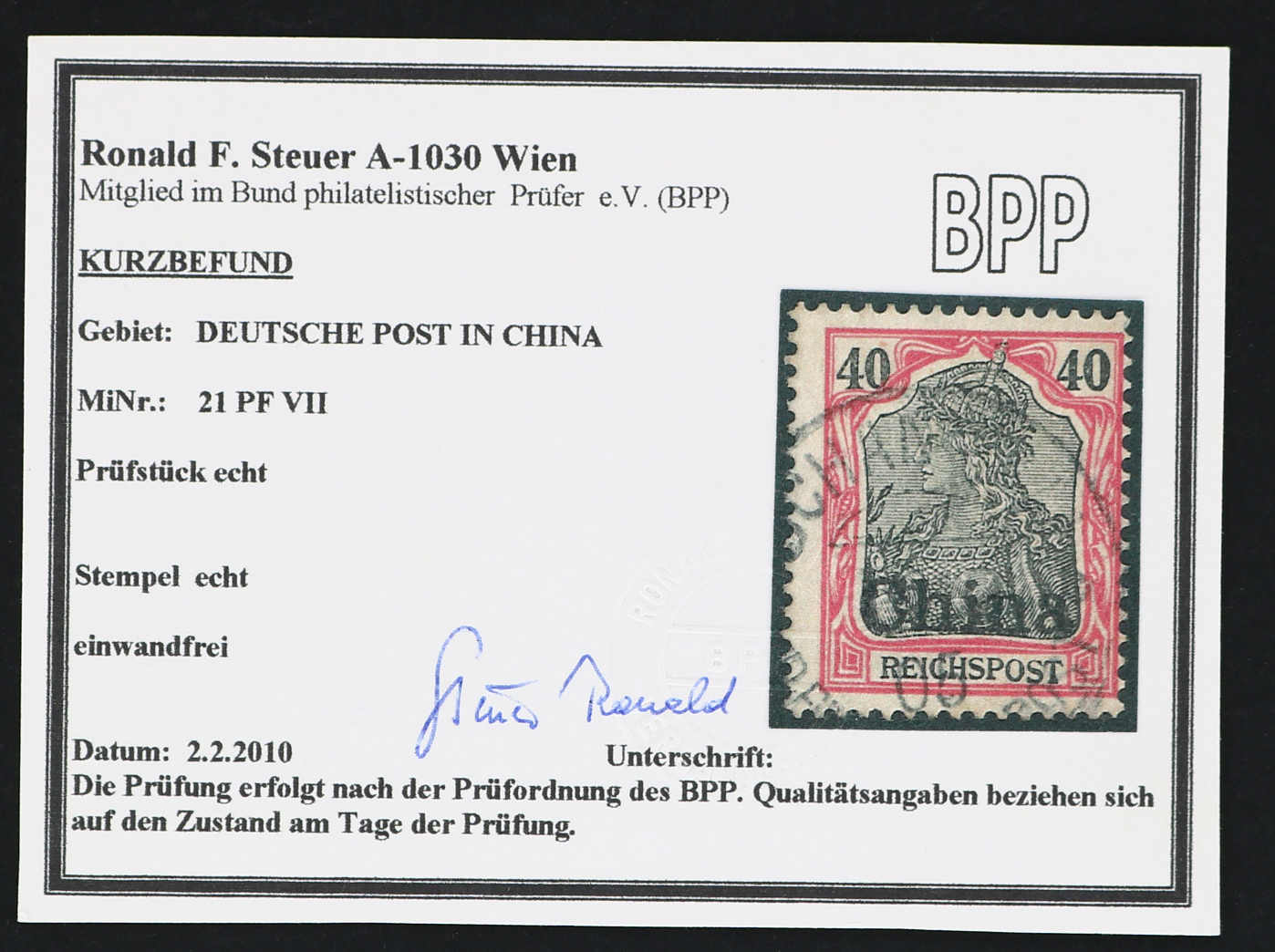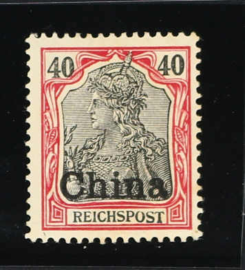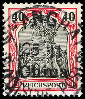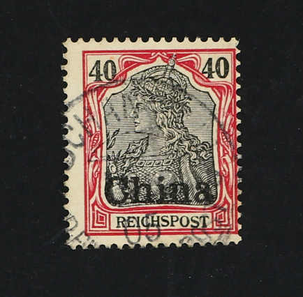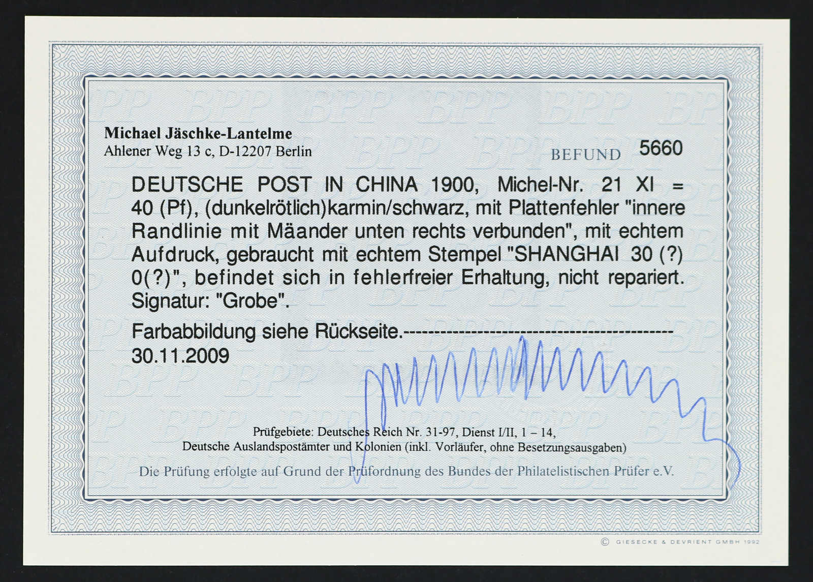 1900, 40 Pfg. Aufdruckausgabe (dunkelrötlich)karmin/schwarz, mit Plattenfehler "innere Randlinie mit Mäander unten rechts verbunden", gestempelt "SHANGHAI 30 (?) 0(?)", einwandfrei, signiert Grobe, Fotobefund Jäschke-Lantelme BPP (ME