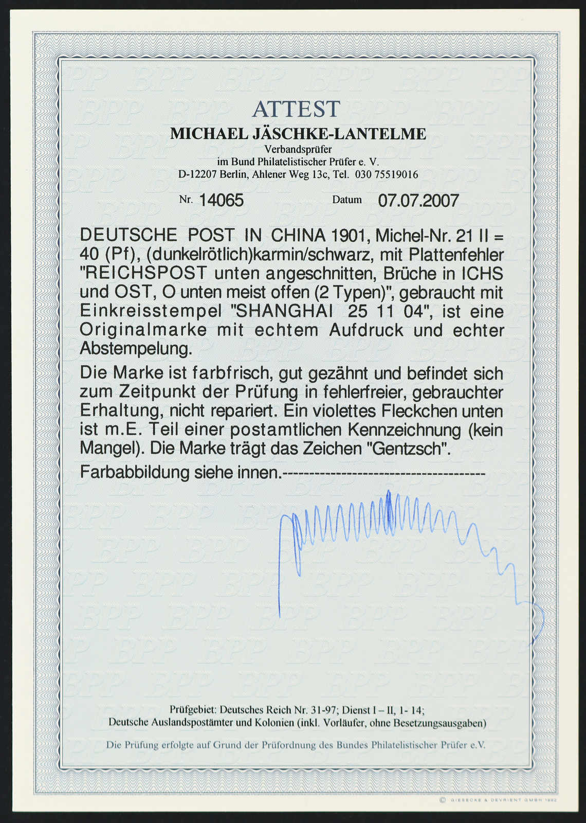 1901, 40 Pfg. Aufdruckausgabe (dunkelrötlich)karmin/schwarz, mit Plattenfehler "REICHSPOST unten angeschnitten, Brüche in ICHS und OST, O unten meist offen", sauber gestempelt "SHANGHAI 25 11 04", einwandfrei, signiert Gentzsch,