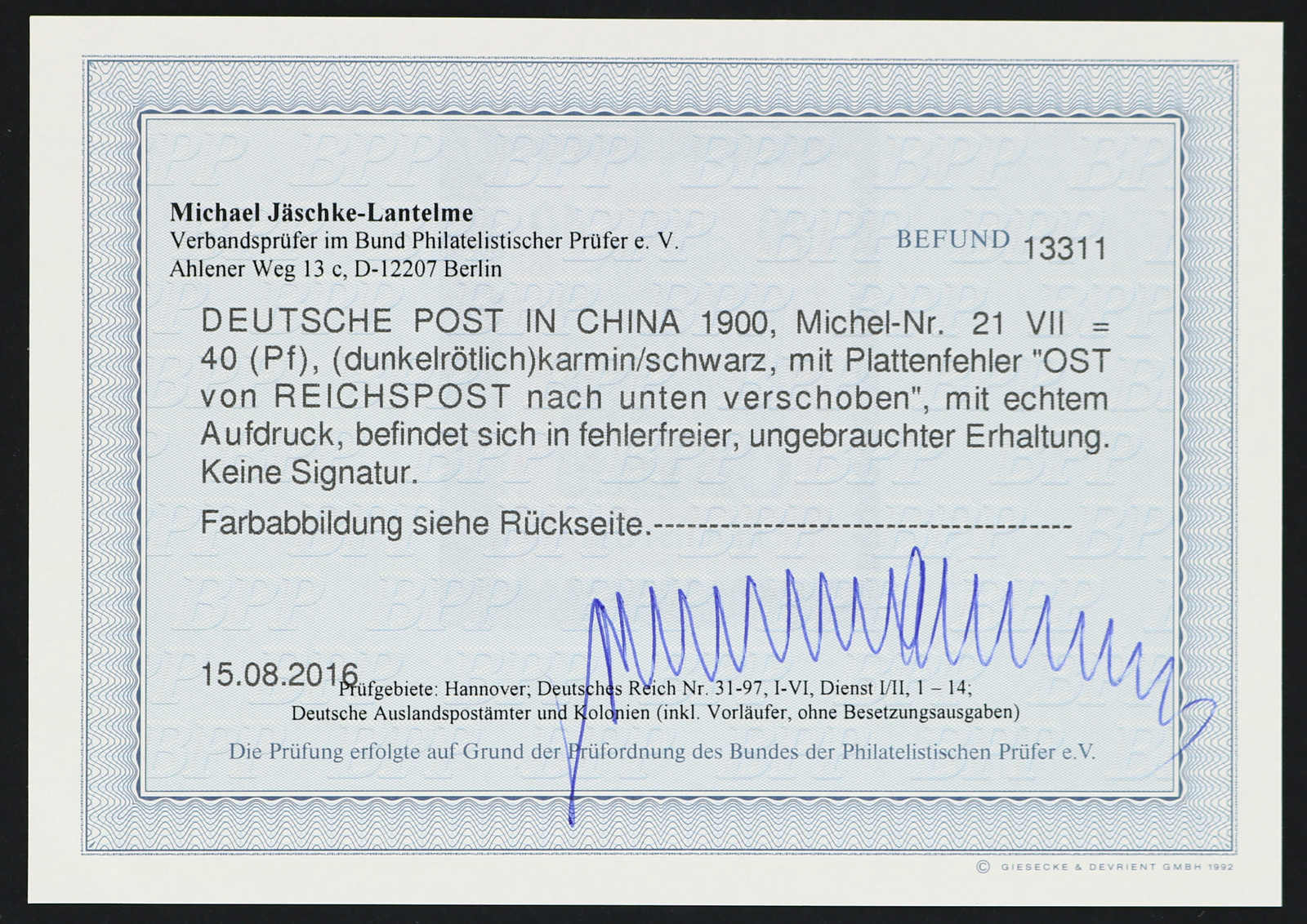 1900, 40 Pfg. Aufdruckausgabe (dunkelrötlich)karmin/schwarz, mit Plattenfehler "OST von REICHSPOST nach unten verschoben", ungebraucht, einwandfrei, Fotobefund Jäschke-Lantelme BPP (ME 400,-) (Image) (imagea)