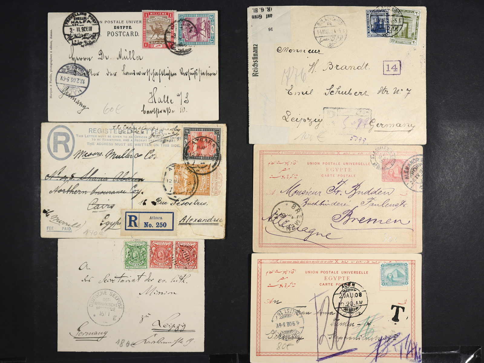 3973 Brief imageAFRIKA: 1891/1924, kl. Posten Briefe/Ganzsachen, dabei Ägypten mit 2 Postkarten und einem Einschreibbrief nach Deutschland, Sudan mit einer frankierten PK nach Halle a. S. und eine R-Ganzsache mit Zusatzfr. nach Cairo, dazu ein Brief Brit. Ostafrika aus Mombasa nach Leipzig, befördert mit der Dt. Seepost der Ostafrikanischen Hauptlinie, ges. 6 Belege, überwiegend gute Qualität (Image)