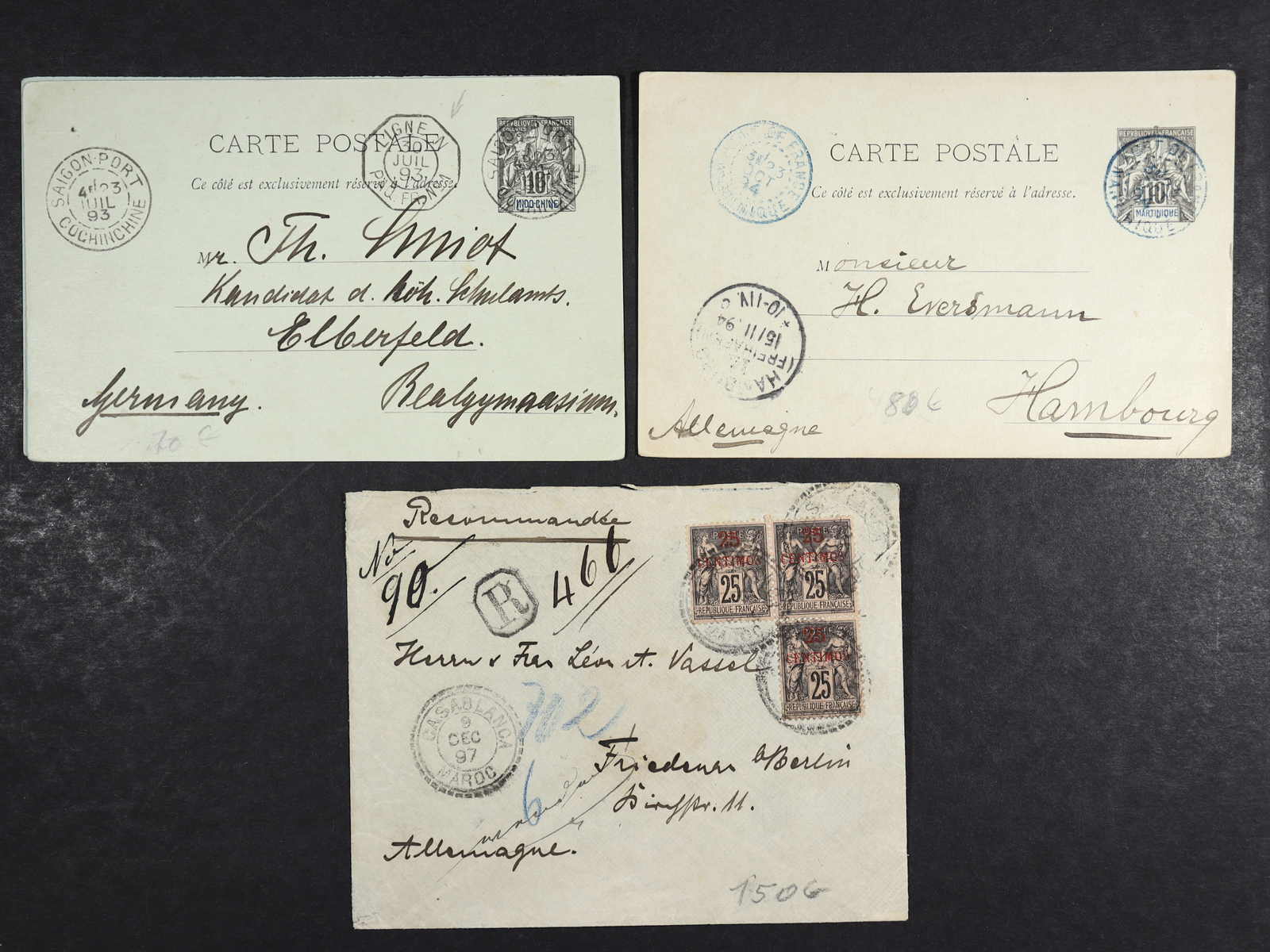3980 Brief imageFRANZÖSISCHE KOLONIEN: 1893/98, kl. Posten von 4 Belegen, dabei 3 Postkarten zu je 10 C. aus Indochina, Martinique und dem Senegal, dazu ein Einschreibbrief, frankiert mit 3mal 25 C., aufgegeben "CASABLANCA MAROC 9. DEC 97", adressiert nach Friedenau b. Berlin, 4 saubere Bedarfsbelege, bitte besichtigen (Image)