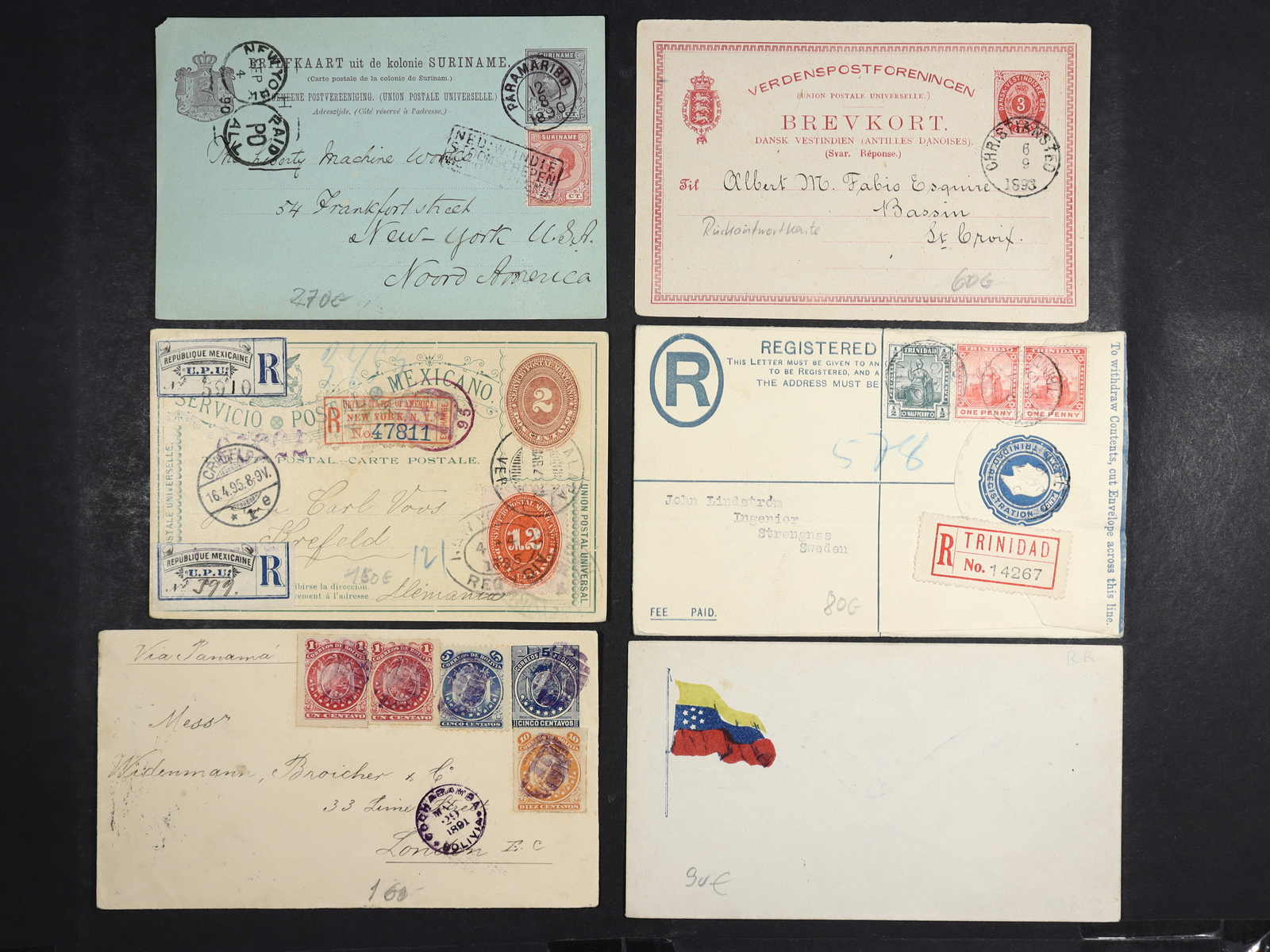 3974 Brief imageMITTELAMERIKA: 1890/1910, kl. Posten Briefe/Ganzsachen, dabei eine Ganzsachen-Postkarte aus Suriname mit Zusatzfr. 1890 nach New York, ein einzeln gebr. Antwortteil einer Doppelkarte von Dänisch-Westindien, aufgegeben "CHRISTIANSTED 6.9.1893", adressiert nach St. Croix und eine R-Ganzsache Trinidad nach Schweden, dazu ein ungebr. Patriotencover von Venezuela und eine 5 C. Ganzsache Bolivien mit Zusatzfr. Mi-Nr. 22 (2), 24, 25, adressiert nach London, ges. 6 Belege, überwiegend gute Qualität (Image)