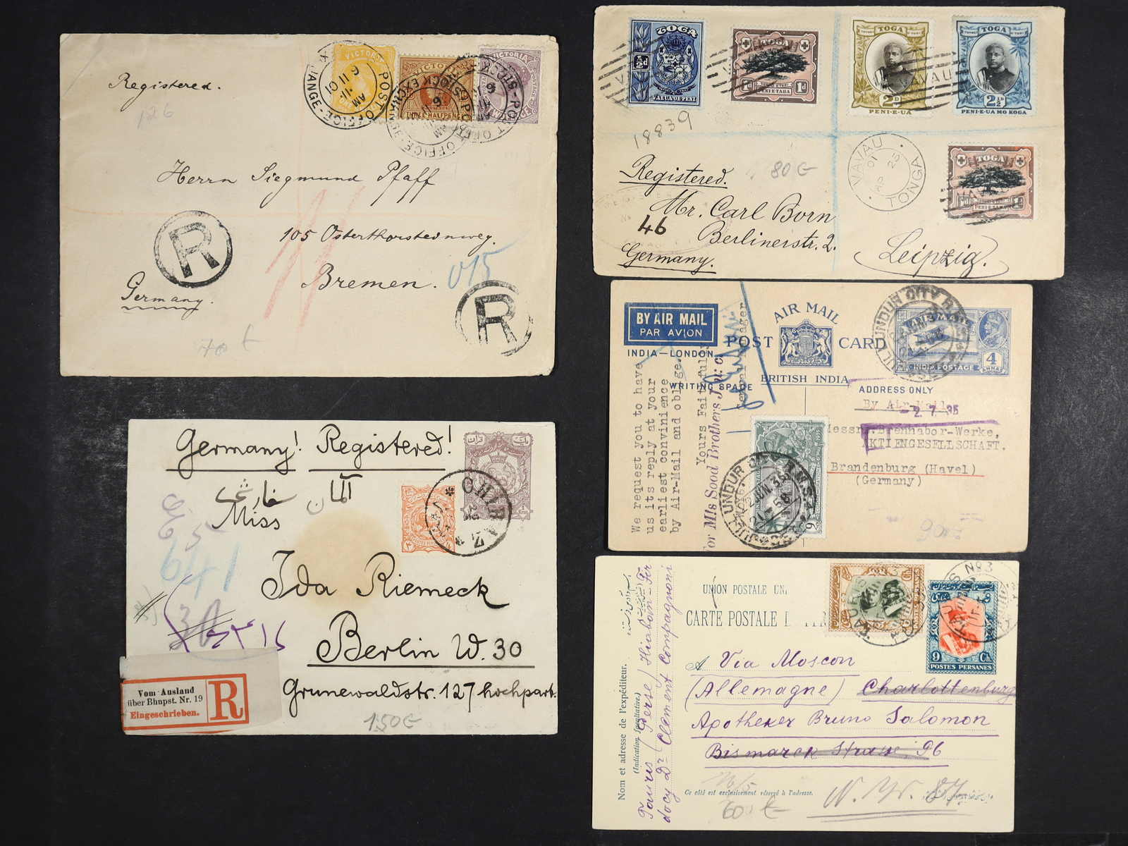 3978 Brief imageASIEN: 1898/1935, kl. Posten Briefe/Ganzsachen, dabei Persien GA-Umschlag zu 1 Kran mit Zusatzfr. als R-Brief vom Vize-Konsulat in Buschär, adressiert nach Berlin, Indien Luftpostkarte zu 4 A. mit Zusatzfr. nach Brandenburg und 2 Belege Ozeanien mit R-Brief aus Tonga 1901 und Victoria (Australien) 1901, beide nach Deutschland adressiert, ges. 5 saubere Belege, bitte besichtigen (Image)