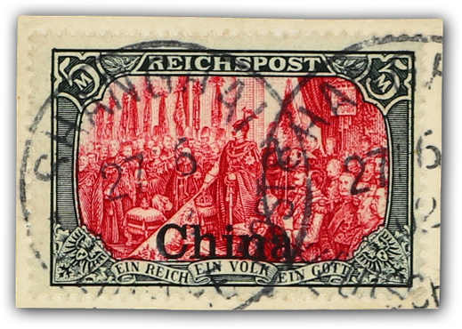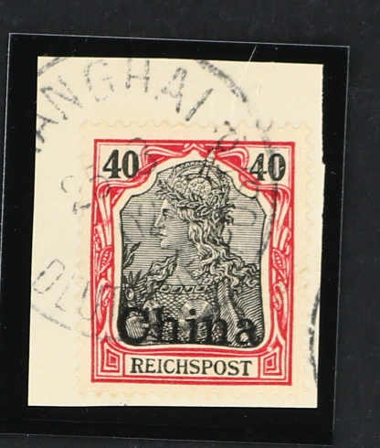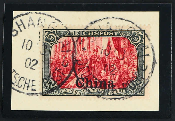 1901, 5 M. grünschwarz/bräunlichkarmin, Germania mit waagerechtem Aufdruck "China" auf Briefstück, Type I mit Nachmalung in Rot und Deckweiß, entwertet "SHANGHAI DEUTSCHE POST 10/3 02", farbfrisch und gut gezähnt, einwandfrei, sign. Bothe