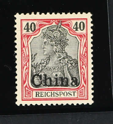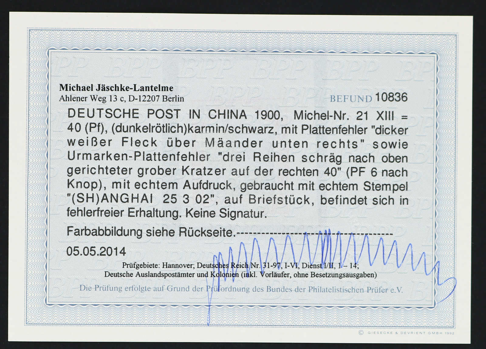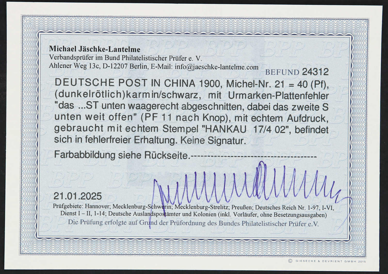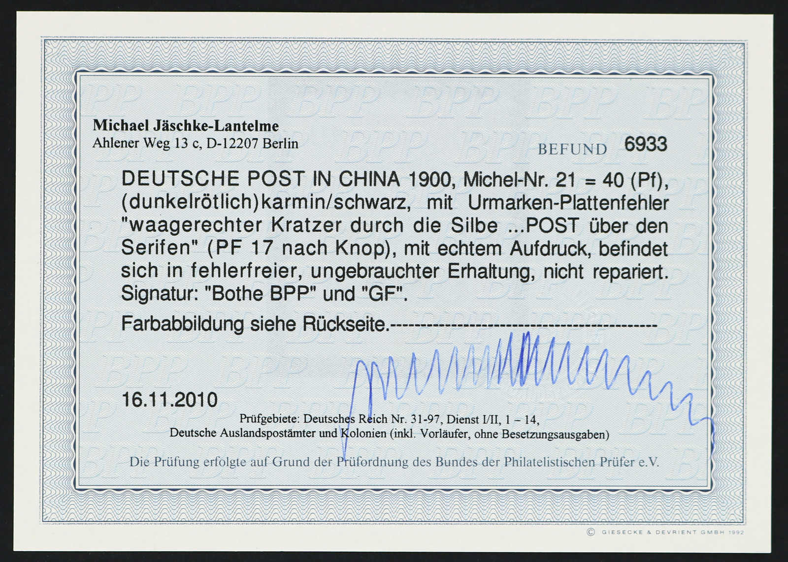1900, 40 Pfg. Aufdruckausgabe (dunkelrötlich)karmin/schwarz, mit Urmarken-Plattenfehler "waagerechter Kratzer durch die Silbe ...POST über den Serifen" (PF 17 nach Knop), ungebraucht, einwandfrei, signiert, Fotobefund Jäschke-Lantelme