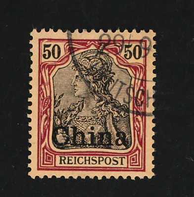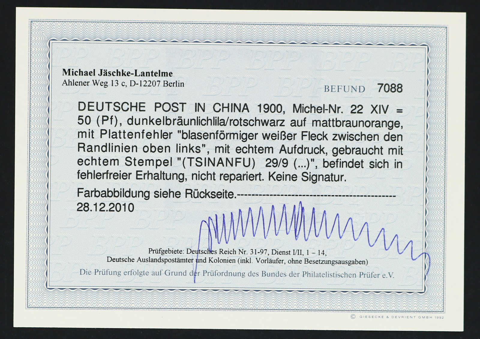1900, 50 Pfg. Aufdruckausgabe dunkelbräunlichlila/rotschwarz auf mattbraunorange, mit Plattenfehler "blasenförmiger weißer Fleck zwischen den Randlinien oben links", gestempelt, einwandfrei, Fotobefund Jäschke-Lantelme BPP (ME 250,-) (Image) (imagea)