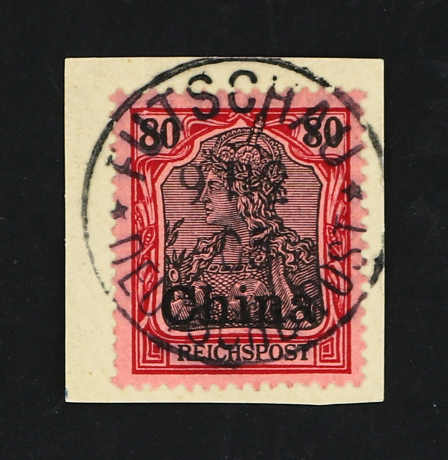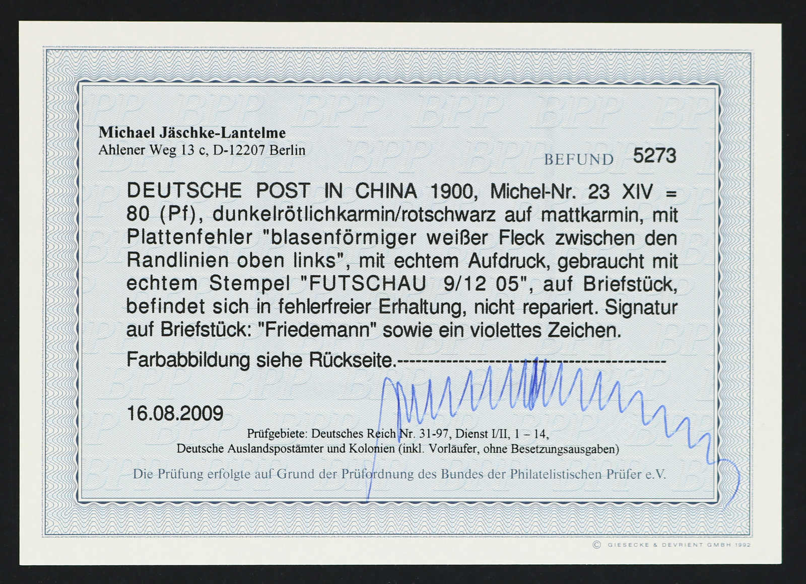 1900, 80 Pfg. Aufdruckausgabe dunkelrötlichkarmin/rotschwarz auf mattkarmin, mit Plattenfehler "blasenförmiger weißer Fleck zwischen den Randlinien oben links", klar gestempelt "FUTSCHAU 9/12 05" auf Briefstück, einwandfrei, signiert,