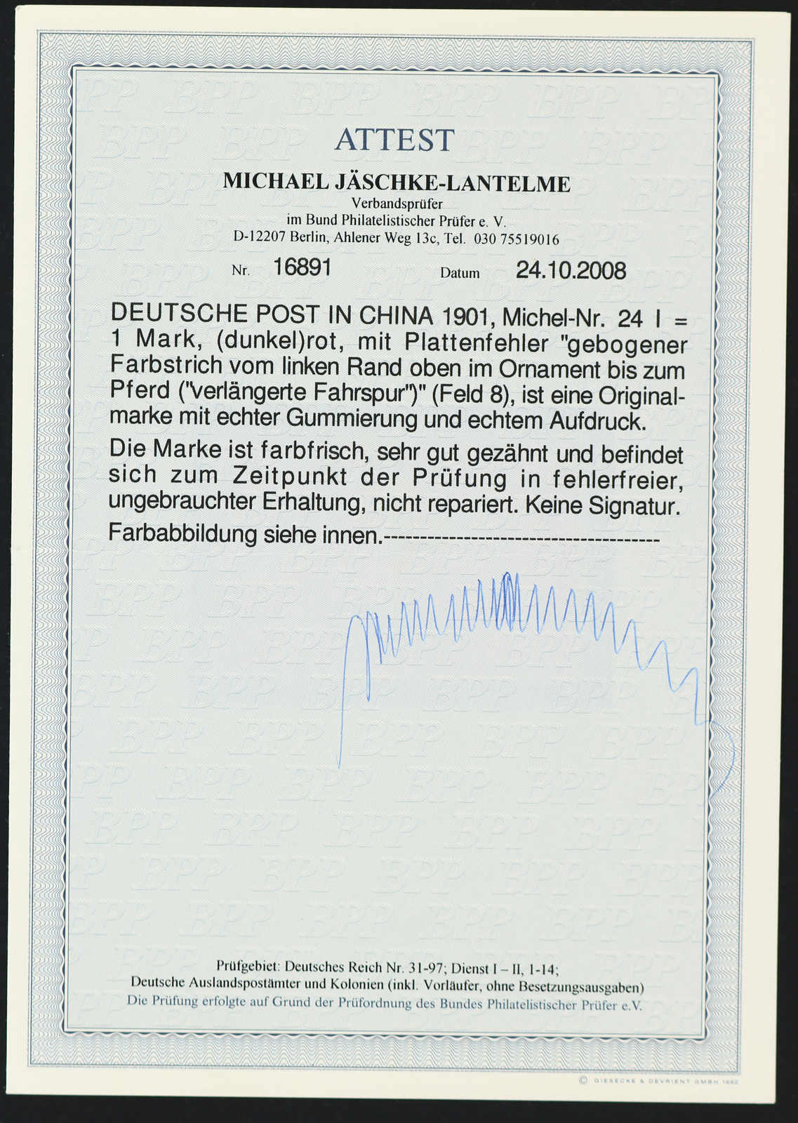 1901, 1 M. Aufdruckausgabe (dunkel)rot, mit seltenem Plattenfehler "gebogener Farbstrich vom linken Rand oben im Ornament bis zum Pferd ('verlängerte Fahrspur')", ungebraucht, einwandfrei, Fotobefund Jäschke-Lantelme BPP (ME 2.000,-) (Image) (imagea)