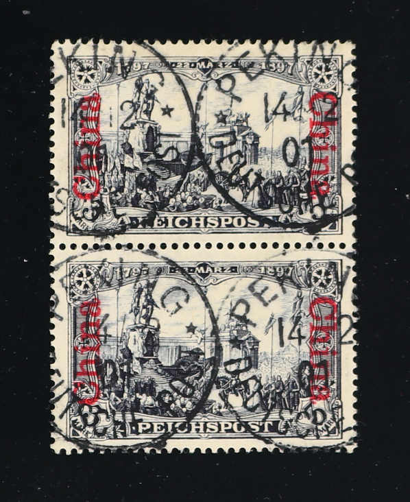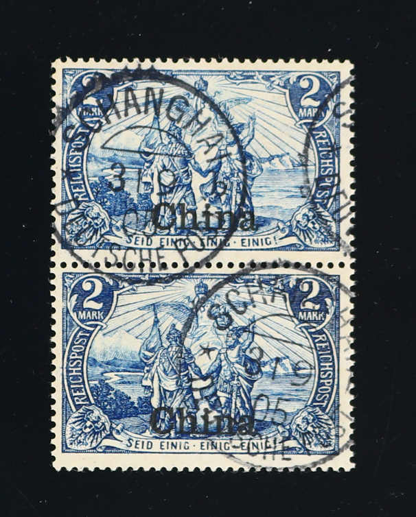 1901, 2 M. schwärzlichblau, Germania mit waagerechtem Aufdruck "Chna" im gestempelten senkrechten Paar, dabei der obere Wert in der Type I der Urmarke und der untere Wert in der Type II der Urmarke, entwertet "SCHANGHAI DEUTSCHE POST 3/9
