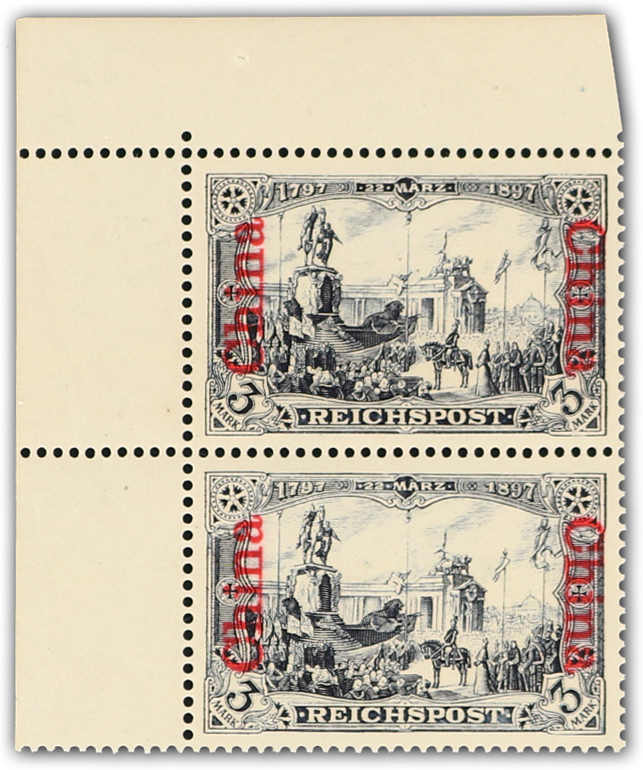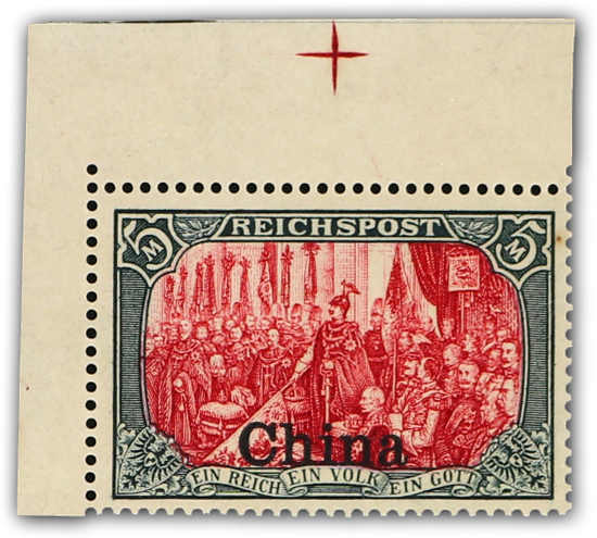 1901, 5 M. Aufdruckausgabe grünschwarz/bräunlichkarmin, Type I mit Nachmalung in Rot und Deckweiß, postfrisches Exemplar aus der oberen linken Bogenecke (linker Rand beschnitten) mit Passerkreuz, farbfrisch, einwandfrei, geprüft Bothe
