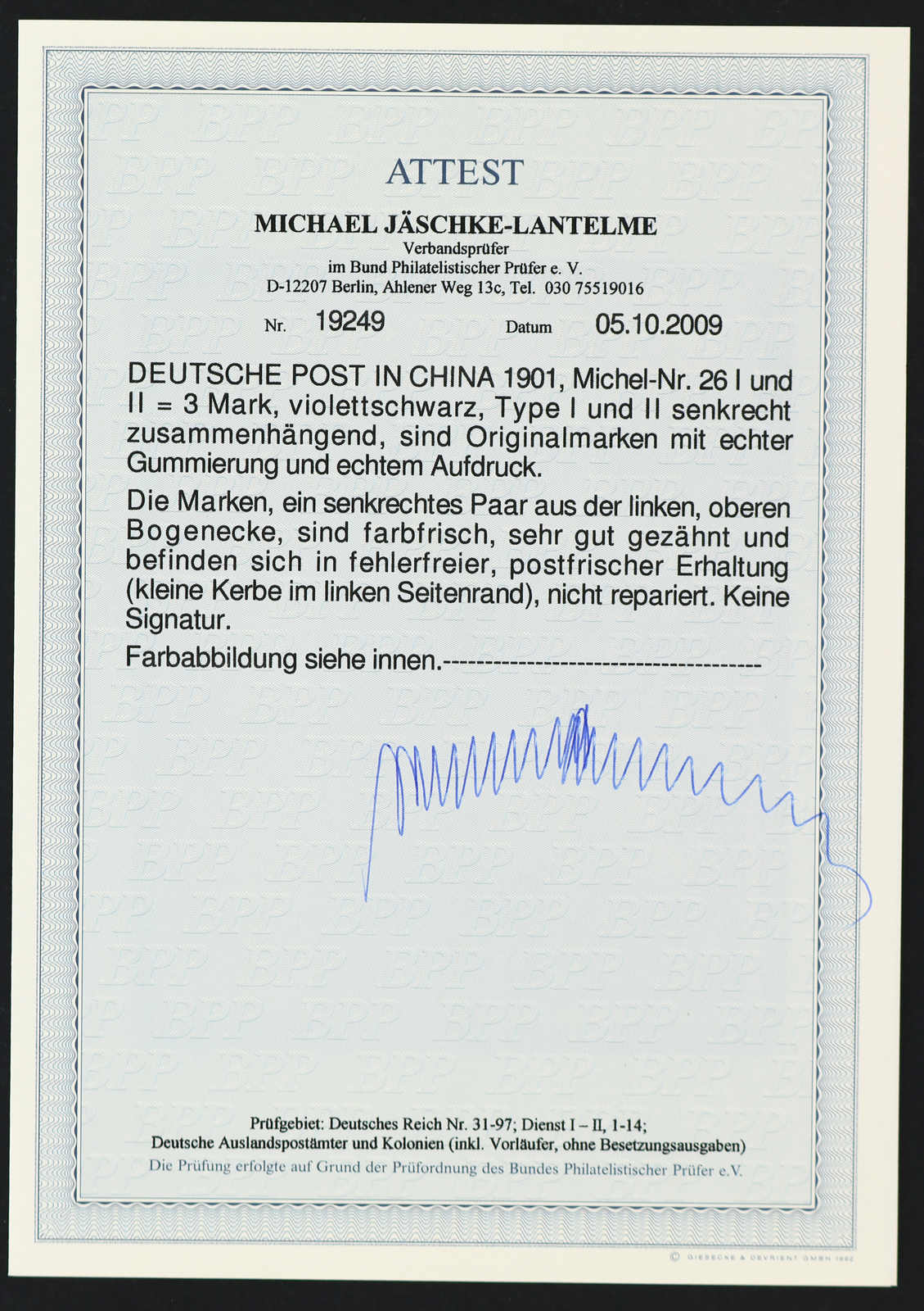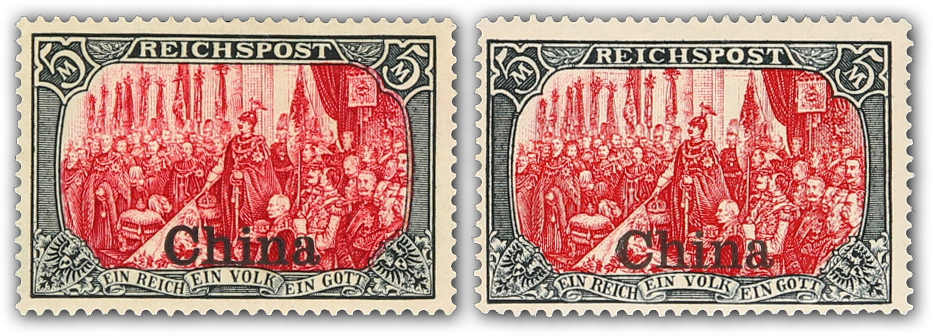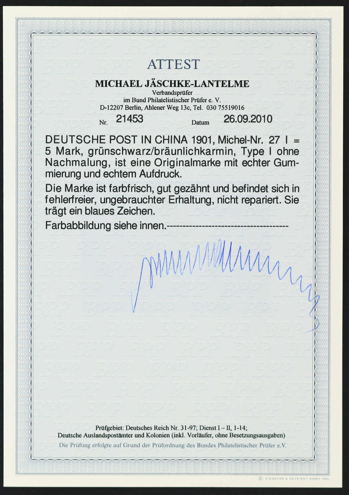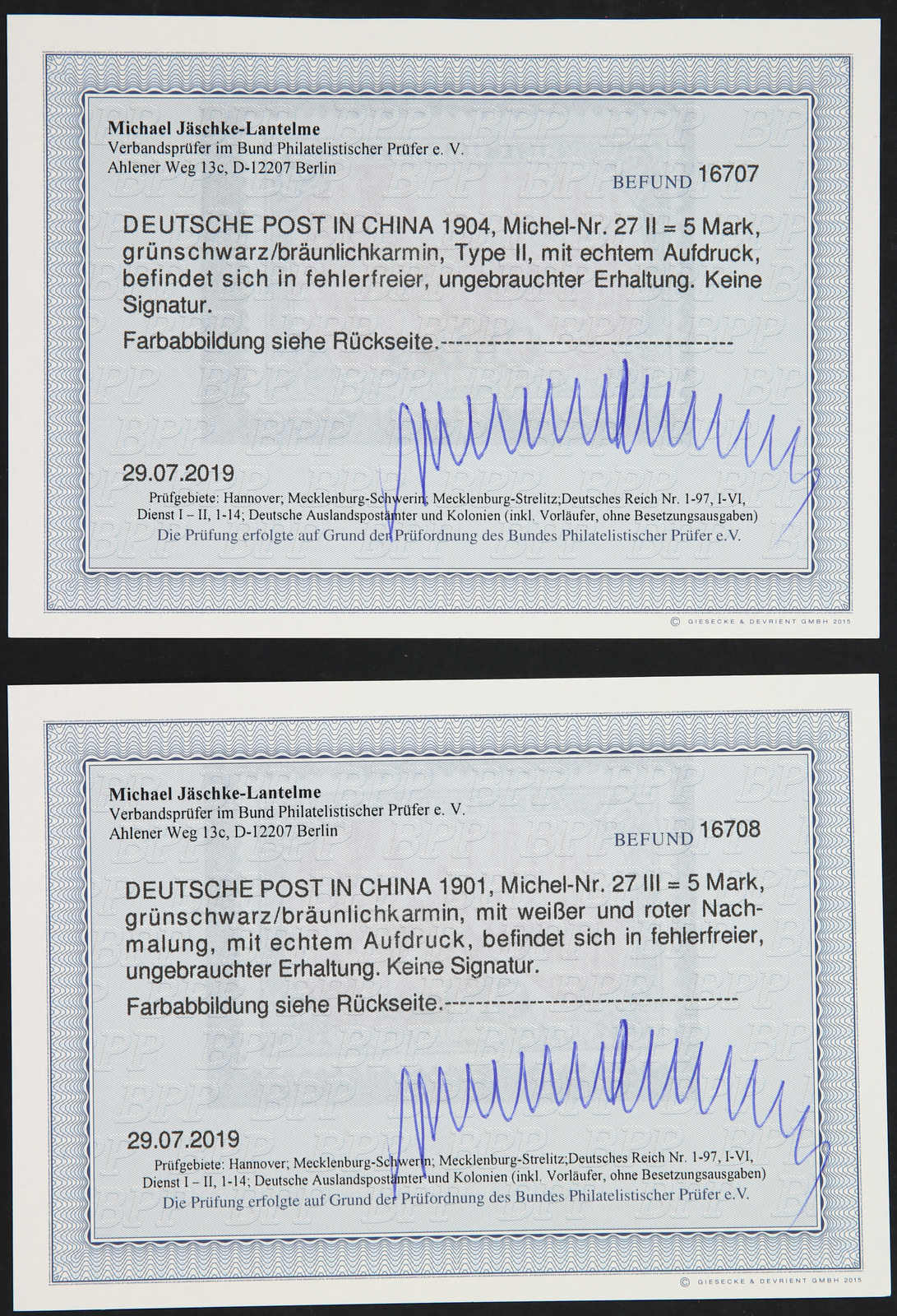 1901/04, 5 M. REICHSPOST mit waagerechtem Aufdruck "China", zwei ungebrauchte Einzelwerte in den verschiedenen Typen der Urmarke, farbfrisch und gut gezähnt, einwandfrei, je Fotobefund Jäschke-Lantelme BPP (ME 520,-) (Image) (imagea)