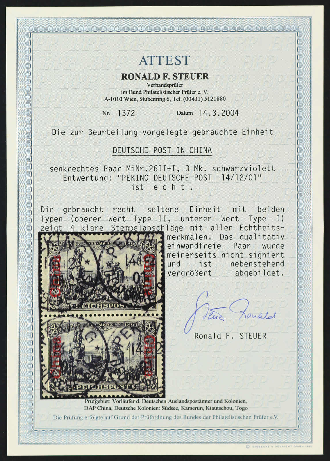 1901, 3 M. Aufdruckausgabe violettschwarz, senkrechtes Typenpaar, sauber gestempelt "PEKING 14/12 01", einwandfrei, Fotoattest Steuer BPP (ME 320,-)