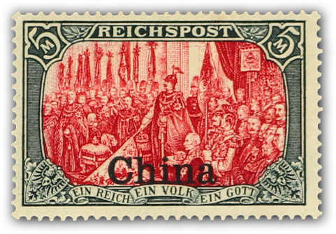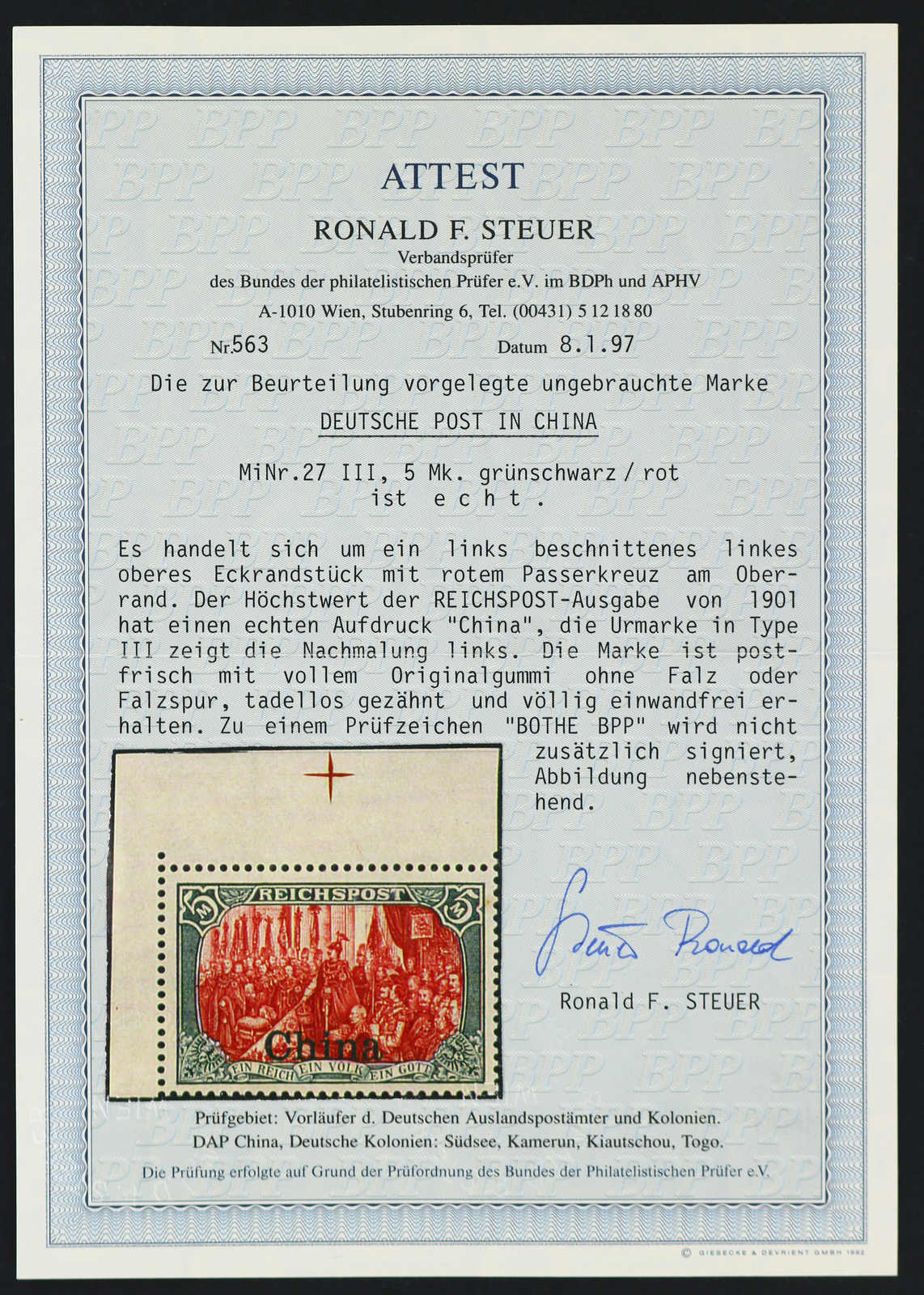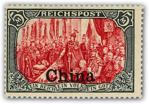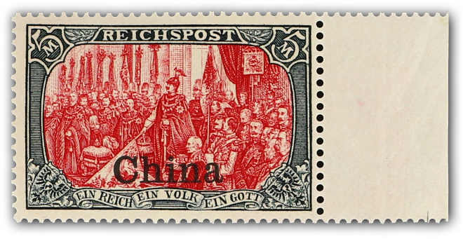 1901, 5 M. grünschwarz/bräunlichkarmin, Germania mit waagerechtem Aufdruck "China", postfrischer Einzelwert vom rechten Bogenrand, farbfrisch und gut gezähnt, einwandfrei, sign. R. Steuer BPP (ME 700,-) (Image)