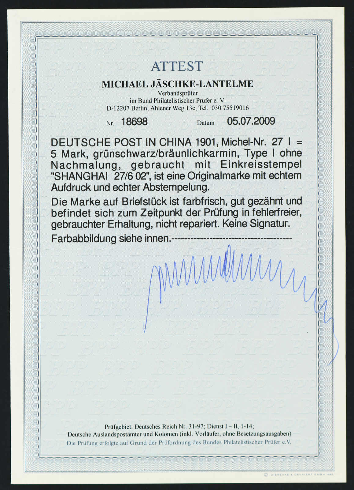 1901, 5 M. Aufdruckausgabe grünschwarz/bräunlichkarmin, Type I ohne Nachmalung, gestempelt "SHANGHAI 27/6 02" auf Briefstück, farbfrisch, einwandfrei, Fotoattest Jäschke-Lantelme BPP (ME 3.000,-) (Image) (imagea)