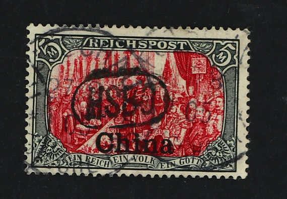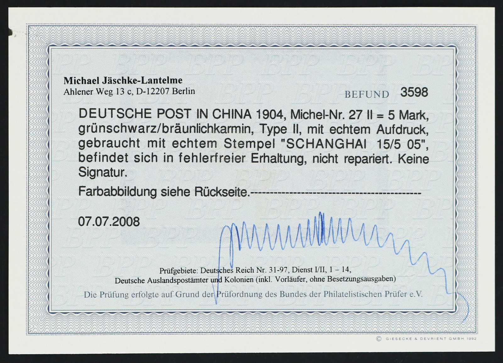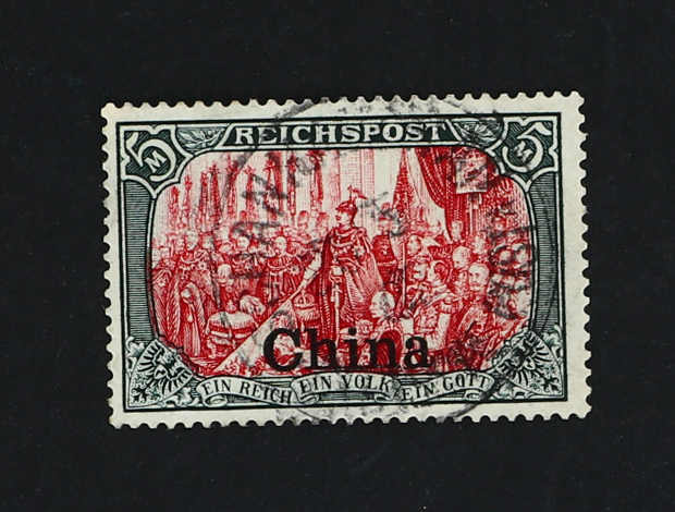 1901, 5 M. Aufdruckausgabe grünschwarz/bräunlichkarmin, Type II, gestempelt "SCHANGHAI 15/5 05", farbfrisch, einwandfrei, Fotobefund Jäschke-Lantelme BPP (ME 400,-) (Image) (imagea)