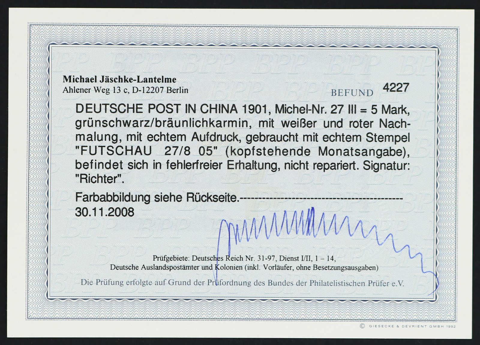 1901, 5 M. Aufdruckausgabe grünschwarz/bräunlichkarmin, Type I mit Nachmalung in Rot und Deckweiß, gestempelt "FUTSCHAU 27/8 05" (kopfstehende Monatsangabe), farbfrisch, einwandfrei, signiert Richter, Fotobefund Jäschke-Lantelme BPP (ME