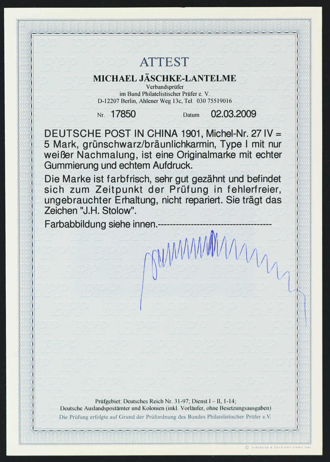 1901, 5 M. Aufdruckausgabe grünschwarz/bräunlichkarmin, Type I mit Nachmalung nur in Deckweiß, ungebraucht, farbfrisch, einwandfrei, signiert Stolow, Fotoattest Jäschke-Lantelme BPP (ME 600,-) (Image) (imagea)