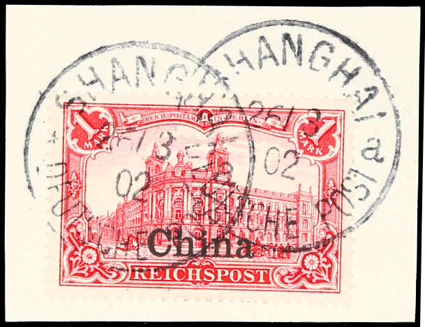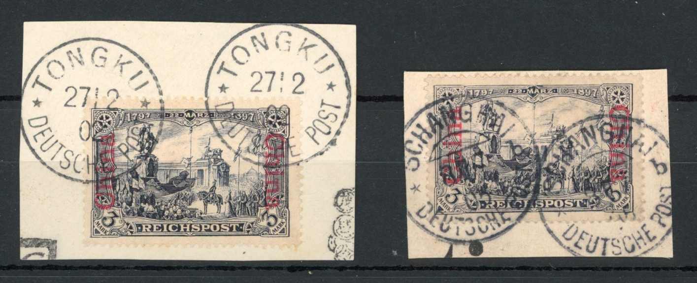 1901, 3 M. REICHSPOST mit Aufdruck "China", zwei gest. Einzelwerte mit den beiden verschiedenen Urtypen der 3 M., je auf Briefstück, entwertet in "TONGKU DEUTSCHE POST" und "SHANGHAI DEUTSCHE POST", einwandfrei, je sign. Bothe BPP (Image)