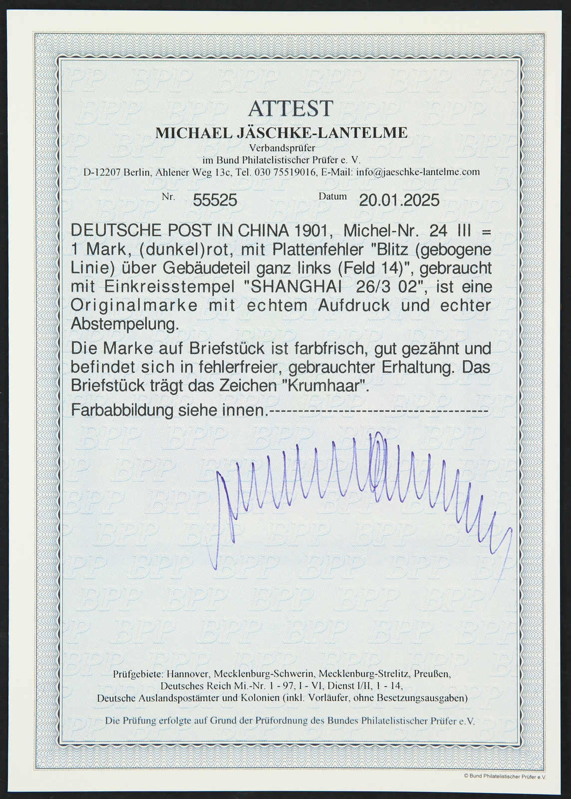 1901, 1 M. Aufdruckausgabe (dunkel)rot, mit Plattenfehler "Blitz (gebogene Linie) über Gebäudeteil ganz links", glasklar entwertet "SHANGHAI 26/3 02" auf Briefstück, einwandfrei, signiert, Fotoattest Jäschke-Lantelme BPP 01/2025 (ME