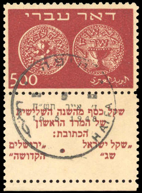 1948, 500 M. antike Münzen rotbraun, gest. Einzelwert mit unten anhängendem TAB, entwertet mit Ersttagsstp. "HAIFA 16.5.48", farbfrisch und gut gezähnt, einwandfrei (ME 900,-) (Image)