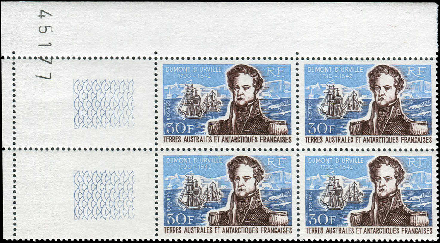 1968, 30 Fr. Dumont im postfrischen Viererblock mit links anhängenden Leerfeldern aus der linken unteren Bogenecke mit Bogenzählnummer, einwandfrei (ME 560,- +) (Image)