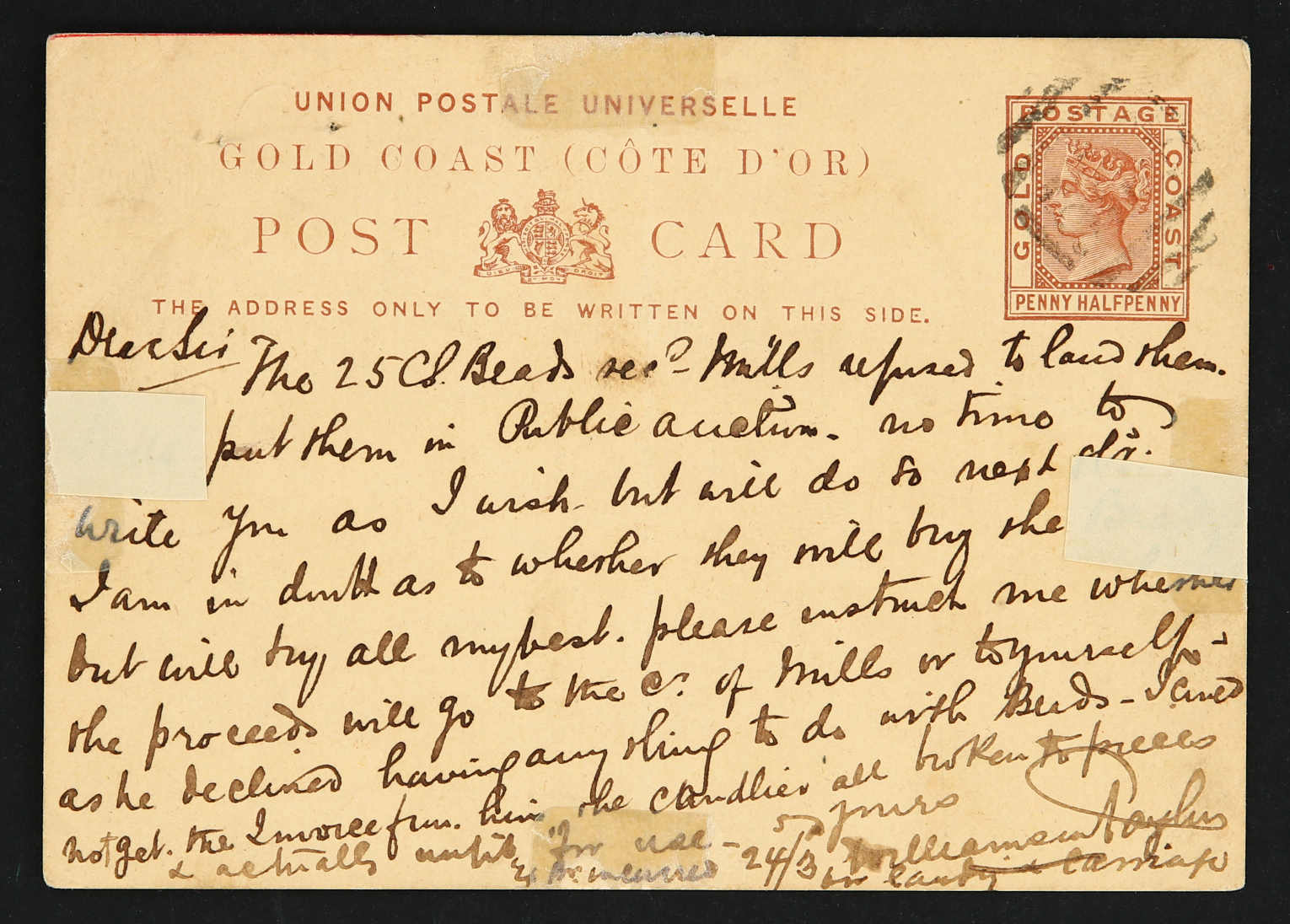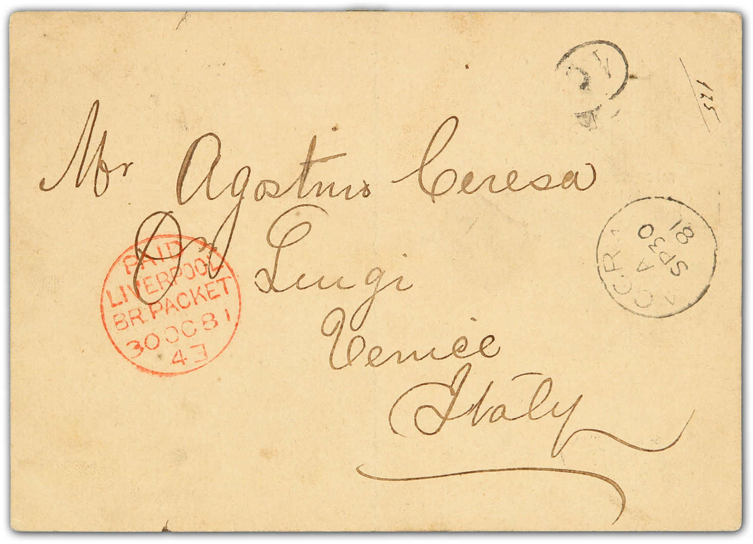 1881, Ganzsachenpostkarte 1½ P. von Accra nach Venice/Italien, Mitteilung auf der Adress-Seite, Anschrift auf der Rückseite, hier roter K1 "PAID LIVERPOOL BR. PACKET 30 OC 81" (Vor-UPU-Zeit, Postkarten waren nicht gestattet), ein Los für