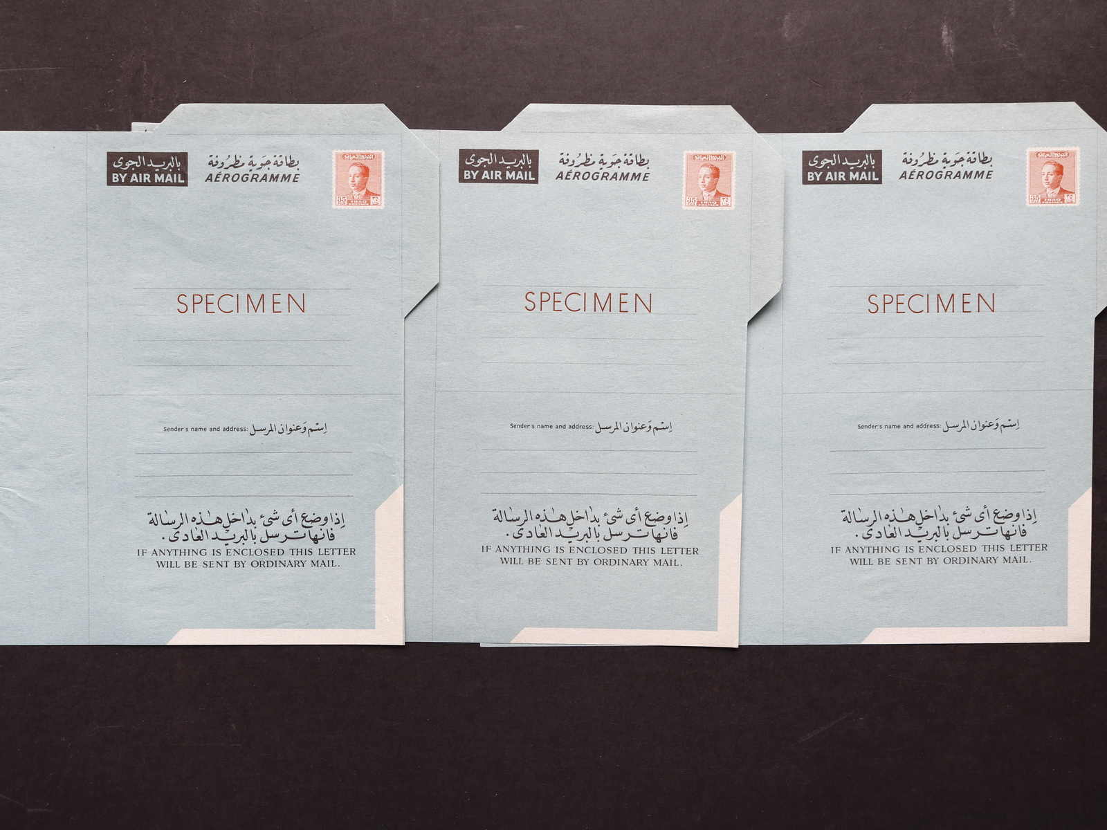 1957, 35 F. König Faisal II., Aerogramm (nicht ausgegeben) mit rotem Aufdruck "SPECIMEN", links oben numeriert, 3 Stück aus dem Bradbury-Archiv, einwandfrei (Image)