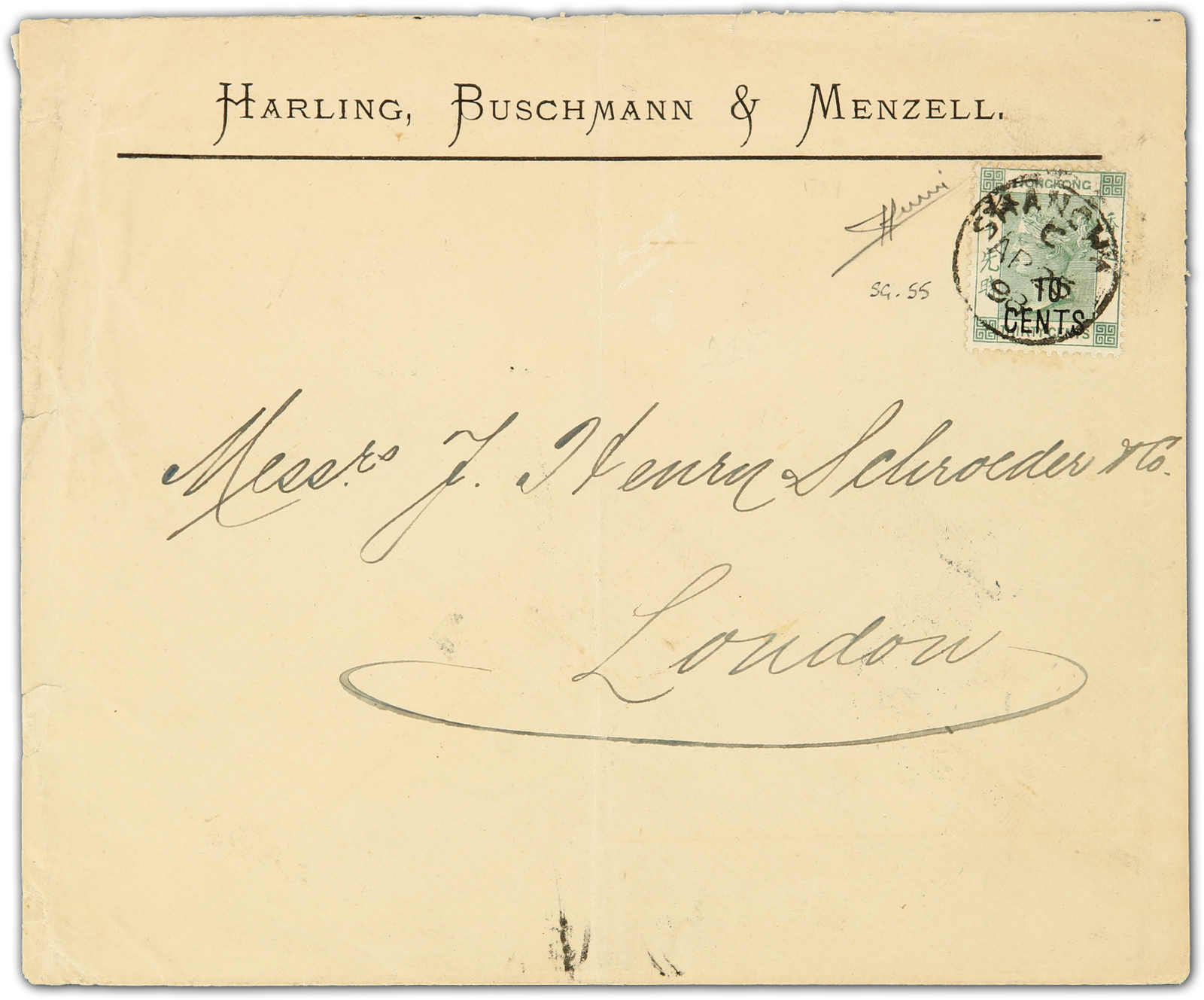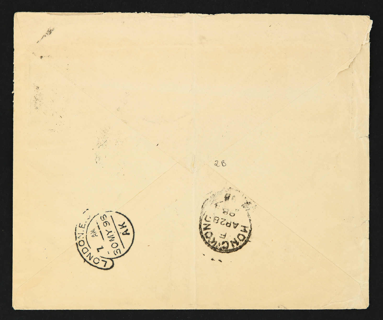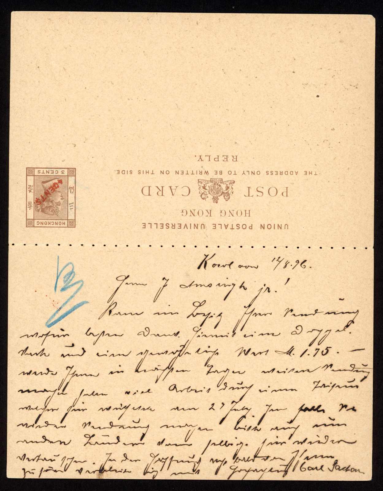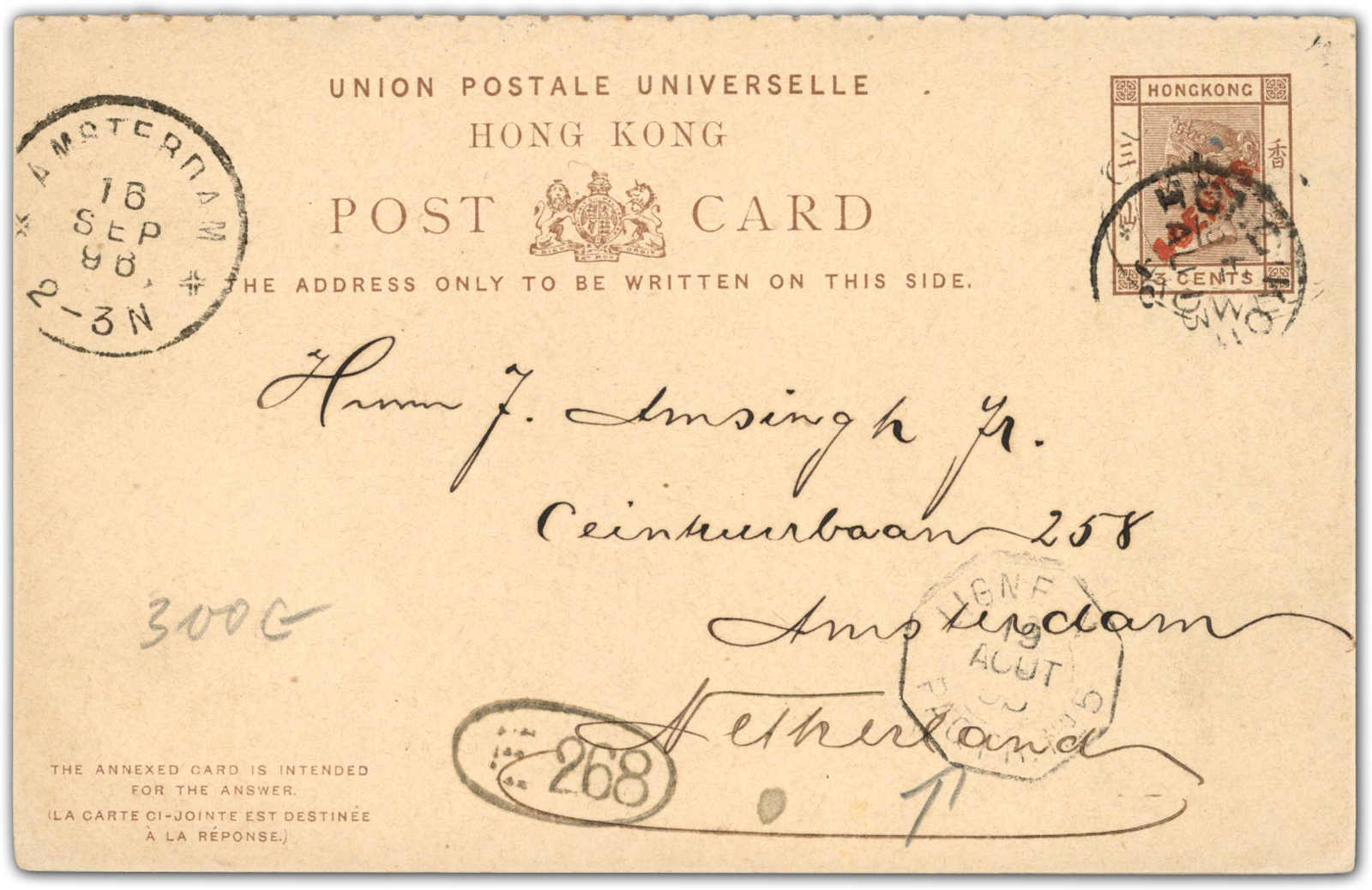 1896, 4 CENTS on 3c brown, used double card, sent from Hong Kong to Amsterdam, carried by french ship mail, arrival dated 16. SEP. 96, long text to reverse, response card unused as usual, fine to very fine, rare (Image) (imagea)