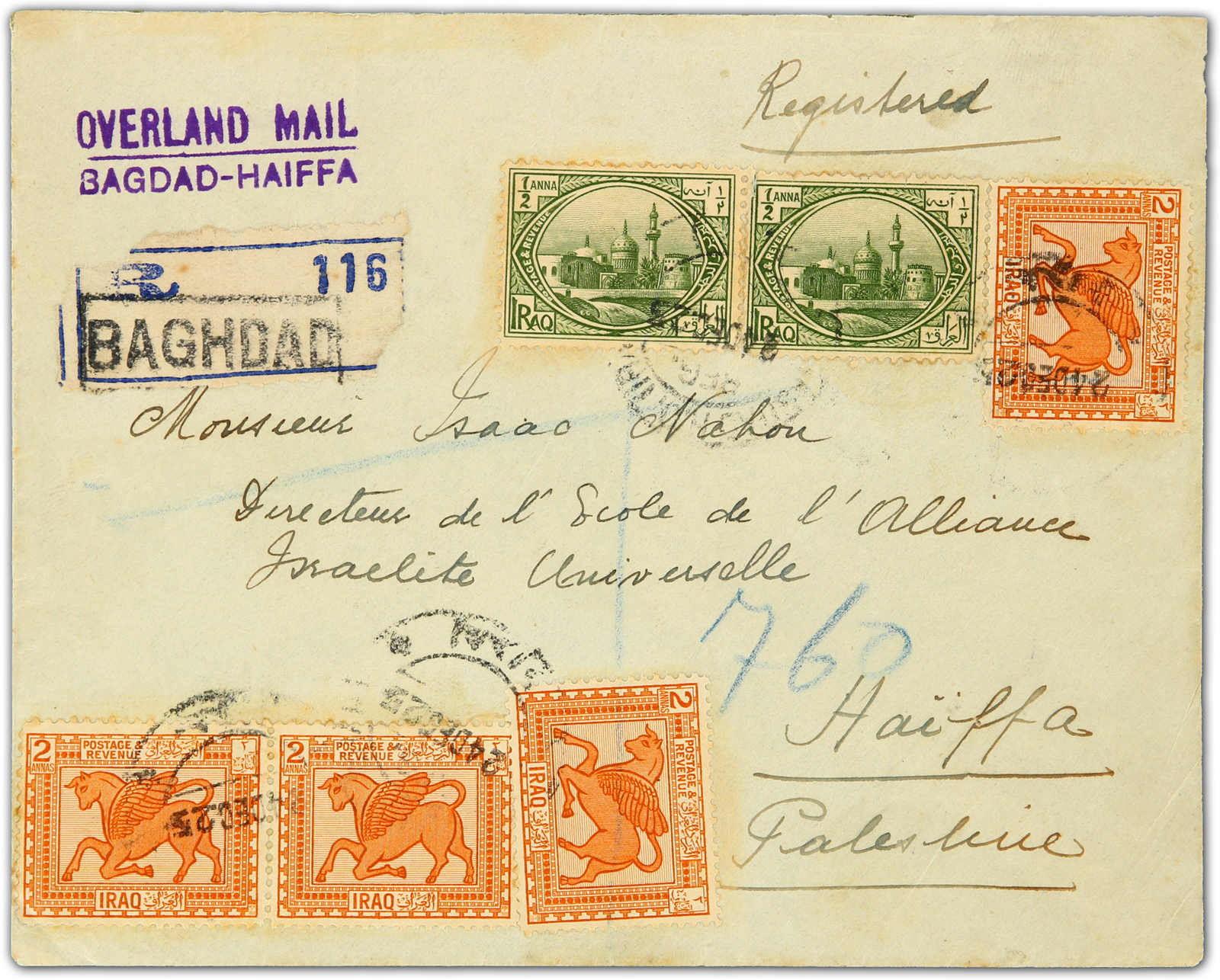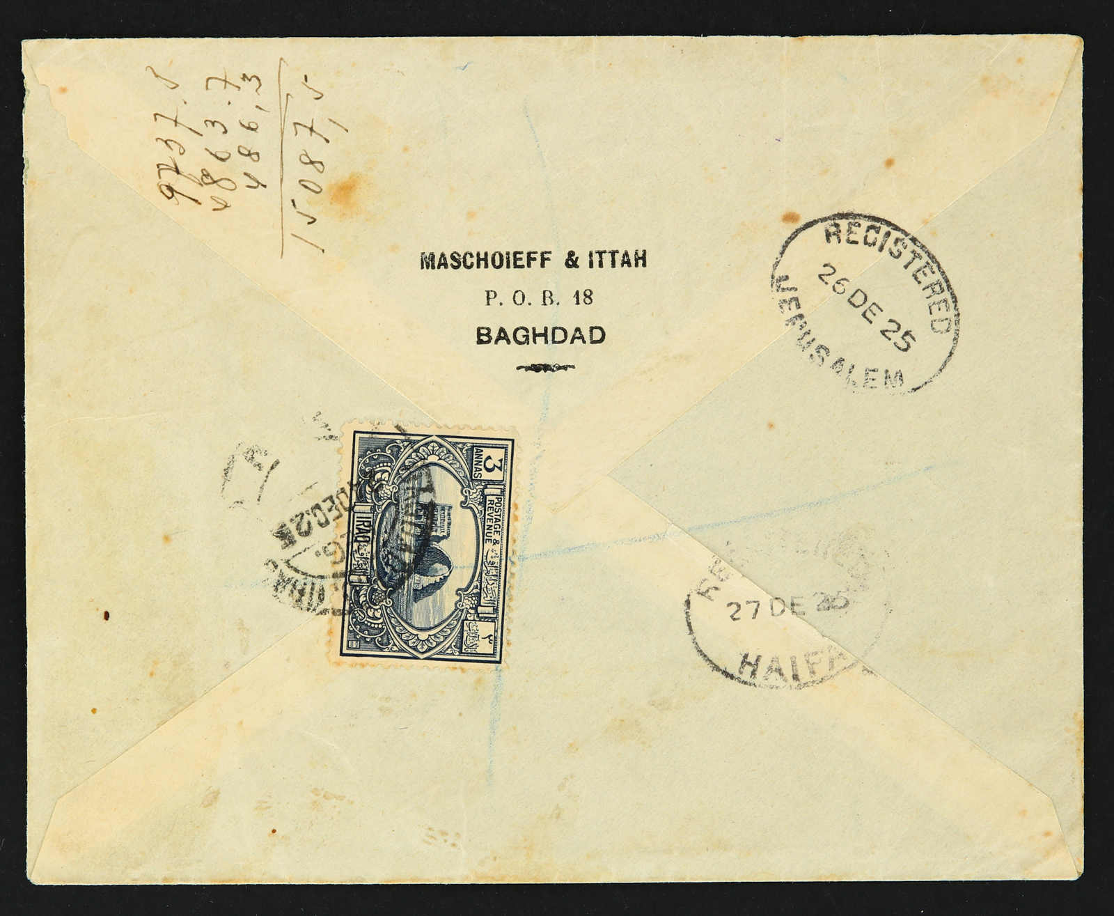1925, registered Overland Mail "Bagdad-Haiffa" bearing 4x2 an. and 2x½ an., on reverse 3 an., tied by Bagdad postmarks sent to Haiffa/Palestine