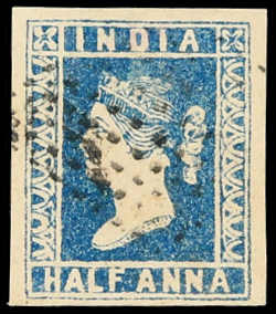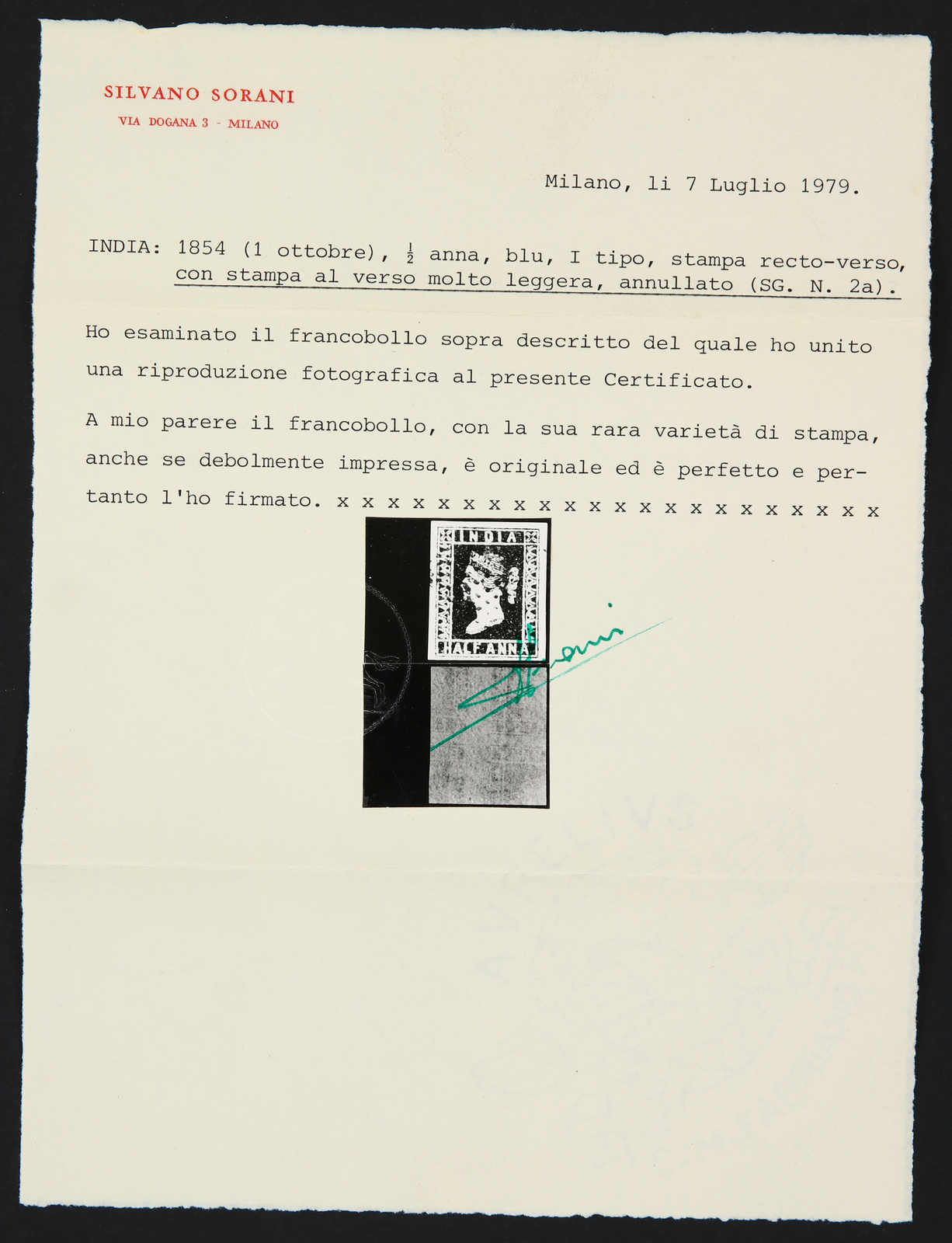 1854, issue ½ Anna blue type I showing recto-verso printed on both sides, fine used stamp with Sorani certificate (Image) (imagea)
