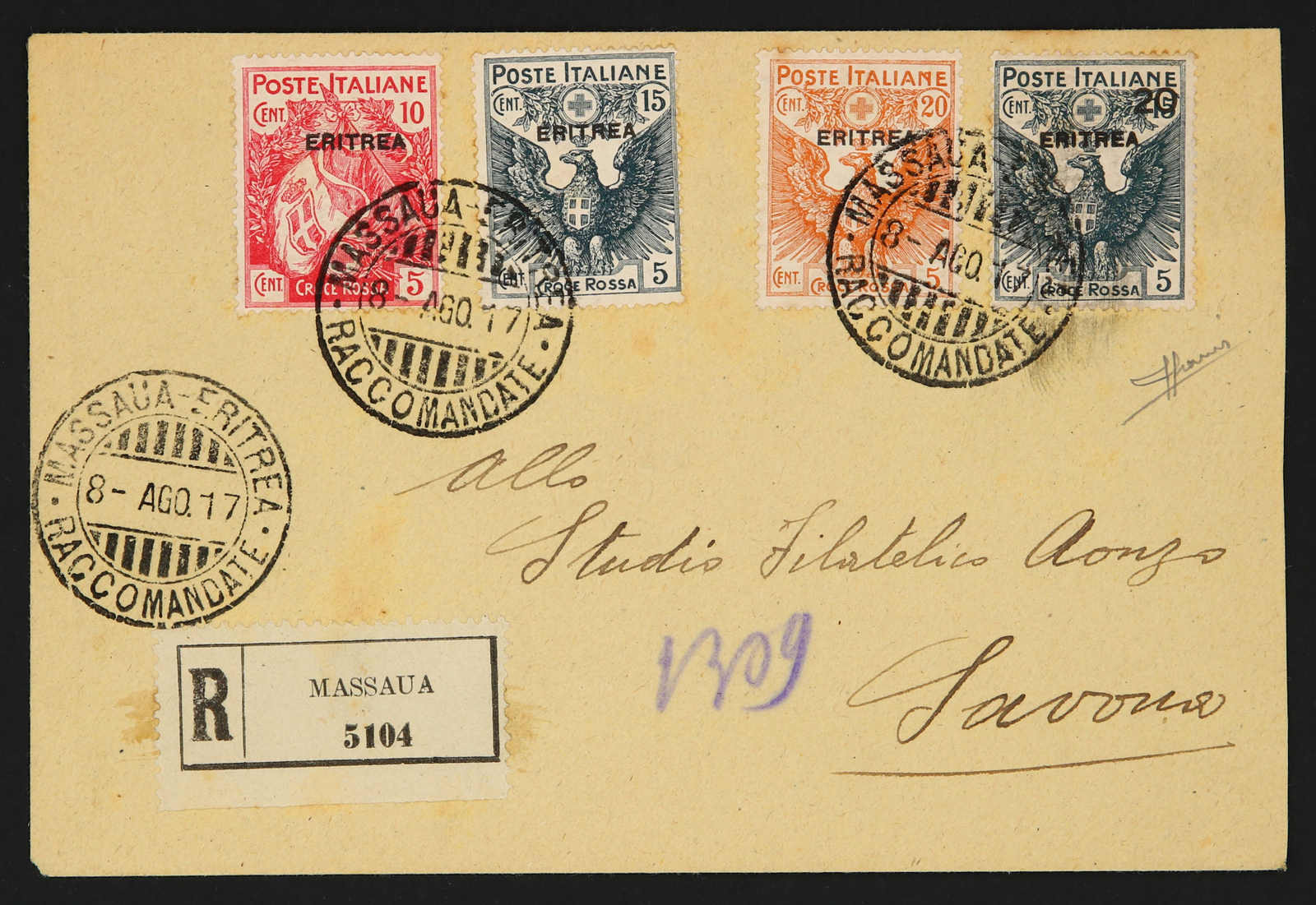 1916, Red Cross issue, full set on registered cover sent from Massaua to Savona/Italy (Sassone 480 €) (Image) (imagea)