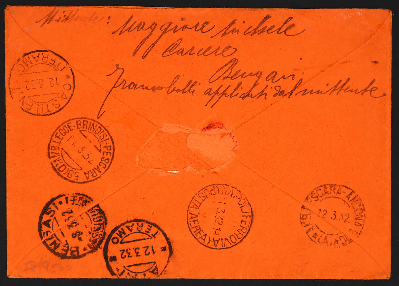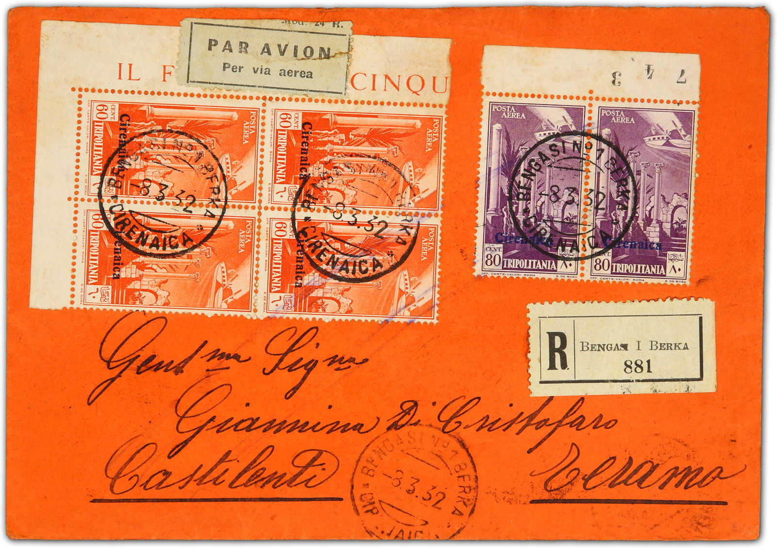 1932, registered airmail cover sent from Berke/Bengasi to Teramo/Italy bearing Cirenaica airmail issue block of four 60 cent. and pair 80 cent., all tied by "BENGASI NO.1 BERKA CIRENAICA" postmarks, on reverse several transit and arrival