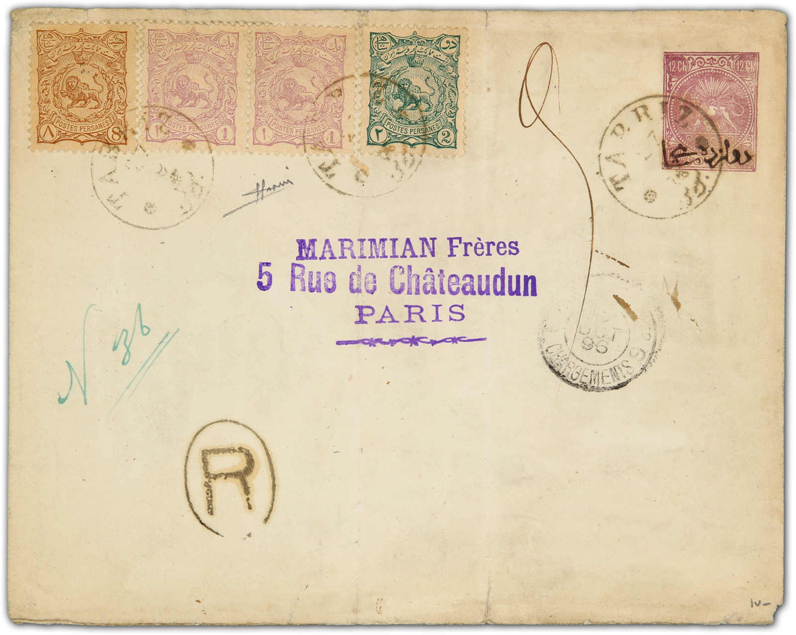 1896, postal stationery envelope of 12 ch. uprated by additional pair 1 c. lilac, 2 c. blue green and 8 c. brown tied by Tabriz postmarks sent registered to Paris, alongside transit, on reverse arrival cds (Image) (imagea)