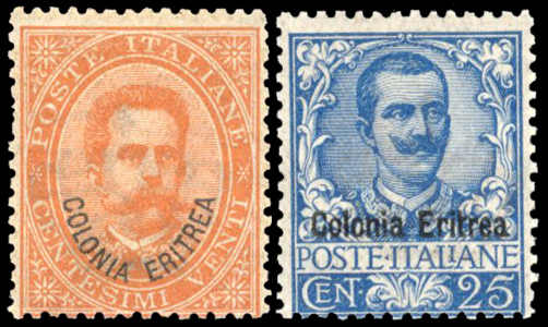 1893/1903, 20c brown orange with curved and 25c bright blue with horizontal ovp "Colonia Eritrea", mh, 20c perforation somewhat irregular, otherwise VF
