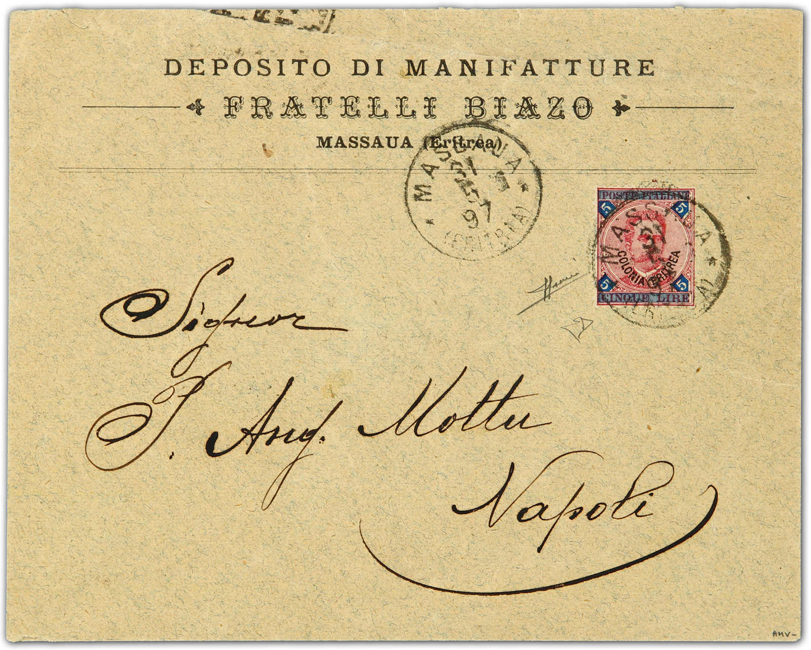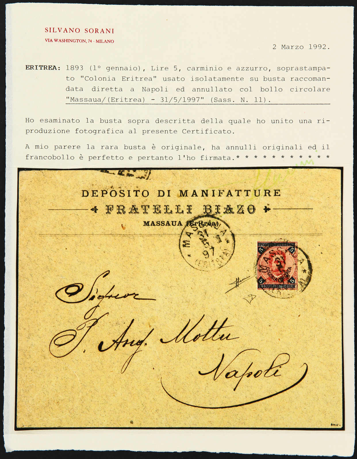 1897, cover bearing single franking of 1893 issue 5 lire with Colonia Eritrea overprint, tied by "MASSAUA" postmark dated 31/5/1897, sent to Napoli, Sassone 10000.€, certificate S.Sorani (Image) (imagea)