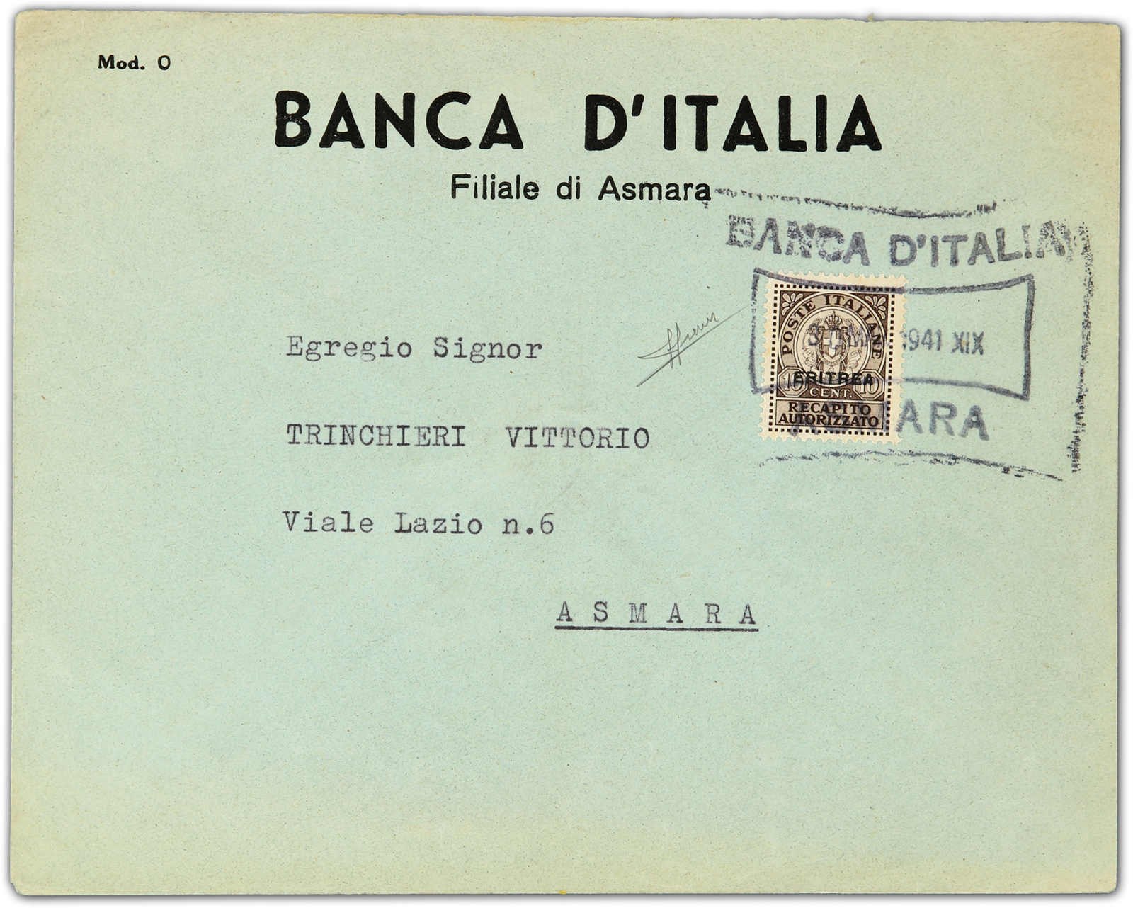 1941, cover bearing single franking authorized delivery stamp of 10 cen, tied by large "Banco d'Italia/Asmara" postmark, Sassone 1000 €, signed Sorani